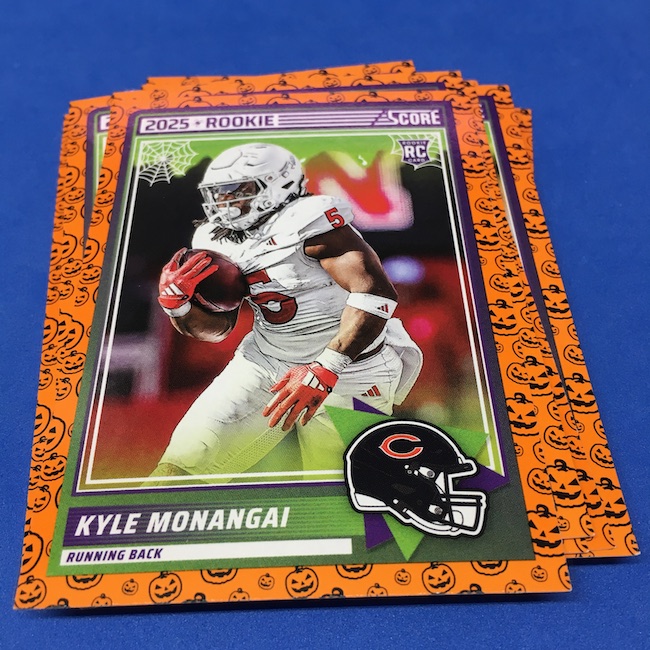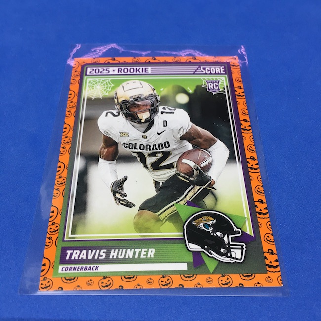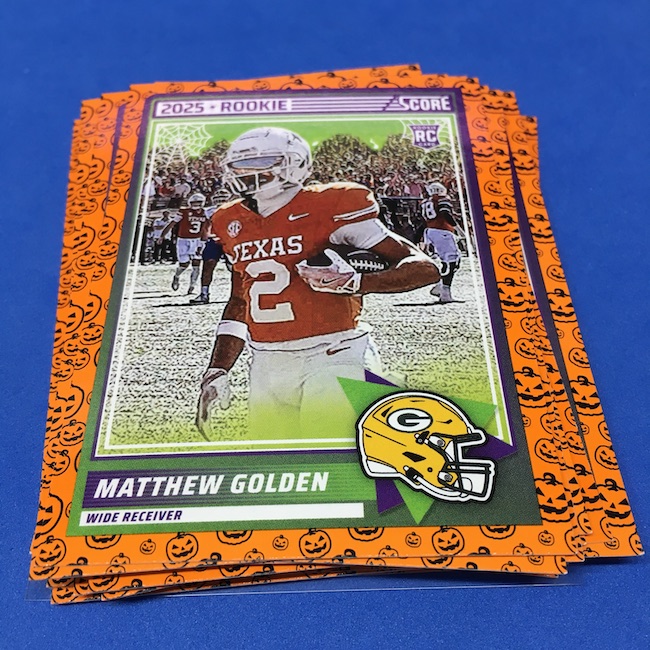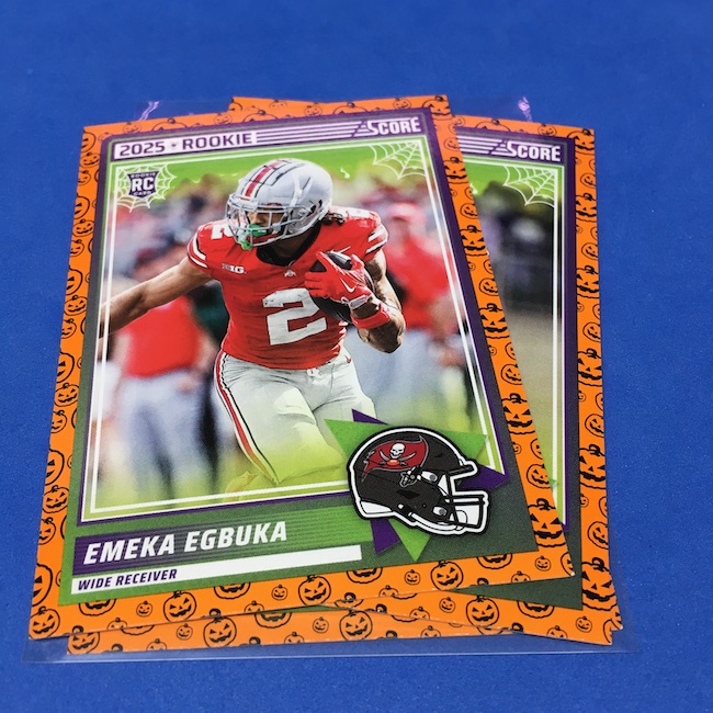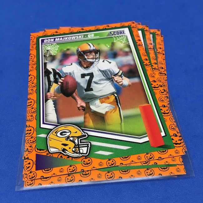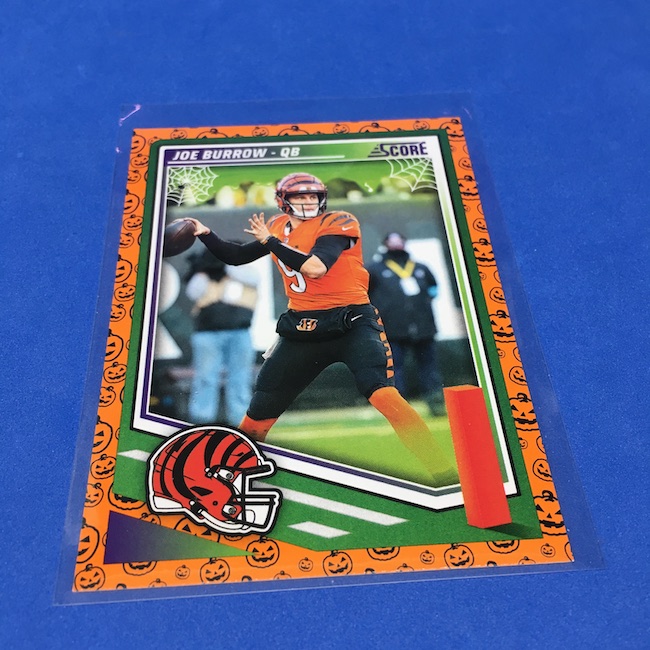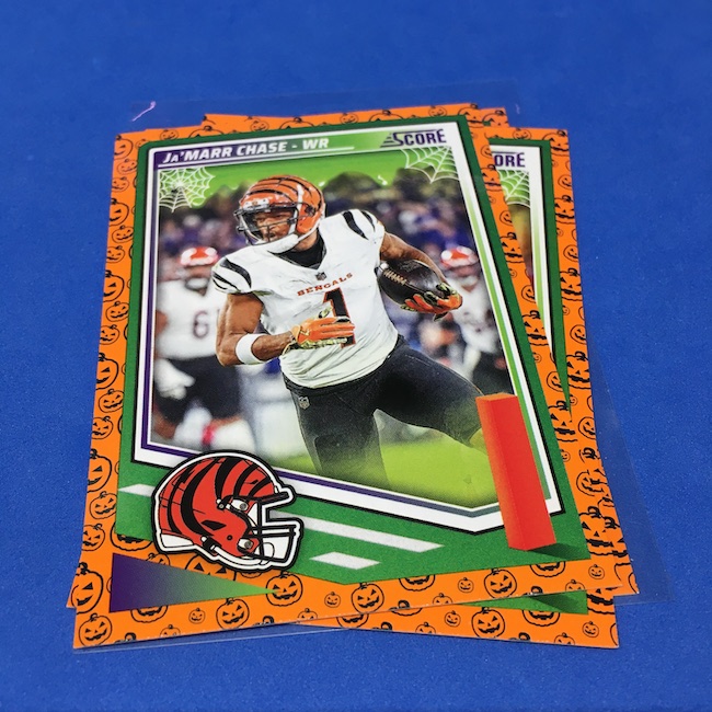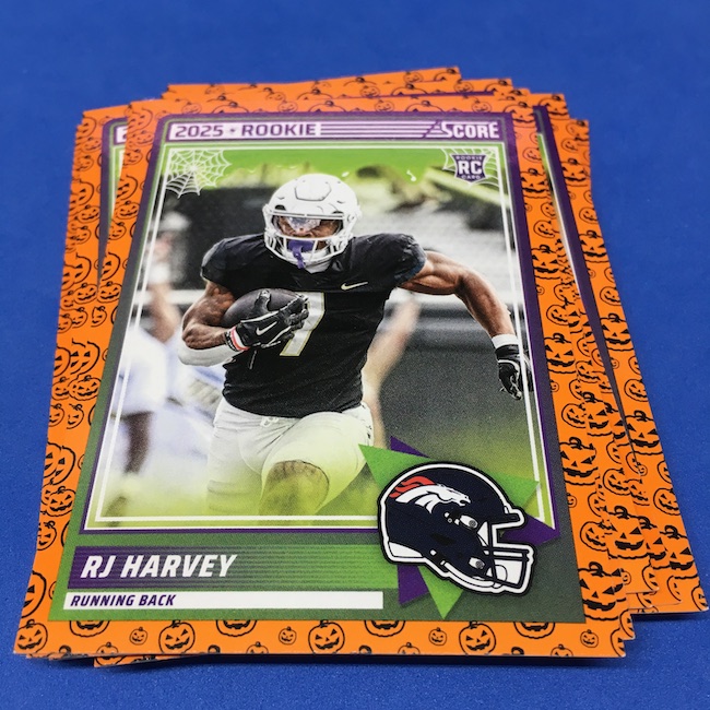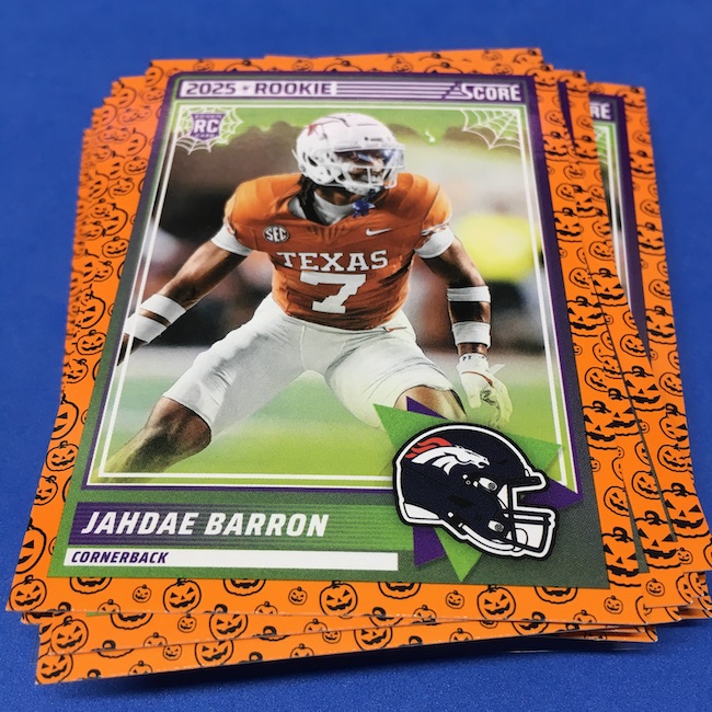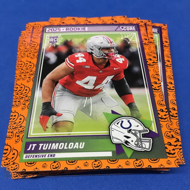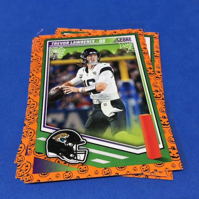 What's Buzz-worthy: My second and last tray of this one? A missing pack ... and that's atop the dramatic changes that made this one a lot less fun to even look at this year. So, with that said, here's what I said last time. ... This candy alternative for Halloween is, in some ways, dramatically different than last year, which will make this a dull break if you opt to open one of these $20 trays expecting a chase. Gone are a pair of set colors in every pack with everything here the same this time -- orange pumpkins -- while other parallels are now serial-numbered with three types. Those are Bats, Trick or Treat and Webs with the easiest /399 and the rarer ones /31. The issue? It's one in 125 packs for a parallel card -- or one in four boxes. Atop that, it's a 300-card base set and 100 rookies ... so your odds of a good name on a parallel are not easy if you do land one. What does that mean? Well, if you do land a good one you might get more for it ... but these boxes are not fun to open at all if you like any kind of variety. And, I guess, technically, this isn't one built for the traditional collector -- it's for Halloween -- but with box prices for even basic stuff like Score relatively pricey this kind of budget-minded rip alternative really isn't drawing me in at all like it should and did last year ... I suspect I might not be alone. A good thing here is that the cards are on the more typical Score stock and are glossed -- unlike last year's really basic feel. There being no chase in most boxes, well, that means you'll see just one more rip of these from me (I ordered two) and that's it until these hit the retail discount bin along with the candy in November. I'm not sure why the inserts needed to be numbered or rarer here ... and does that one extra step really cost so much that they need to be as rare as they are? This would be really fun with five or 10 parallel types and something from those seeded into every pack ... or even last year's approach with more numbered stuff added if they want to add value. I may not rip a lot of football going forward -- from any company -- as stuff like this just doesn't seem to make sense atop the here/coming licensing barriers of teams and players you may or may not find. Adding autos adds costs ... adding some parallel colors and sheets costs less. Rather than dabble, I may pick off singles that jump out at me but that puts this one in competition with anything and everything out there among the sea of singles ... meanwhile, this should be an easy "I'll try it" rip where I buy more than I should if I think it's reasonable that I'd find something, anything more than the basics. If finding any parallel of any guy is one in 125 packs, then I'll let you do the math for what it takes to find one of any of the 400 players found here.