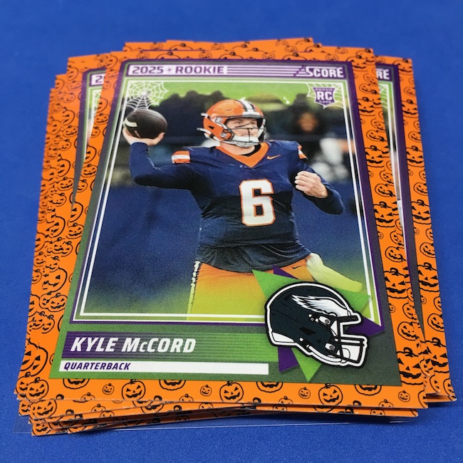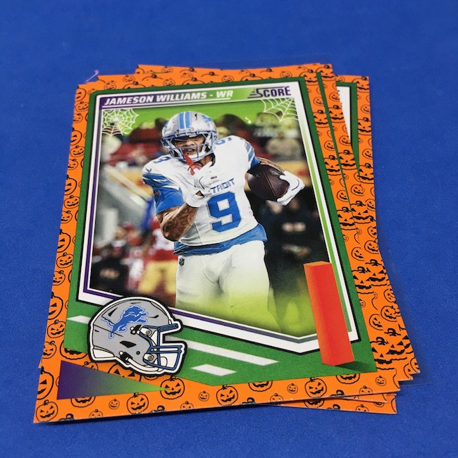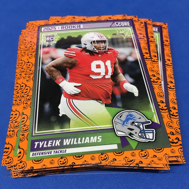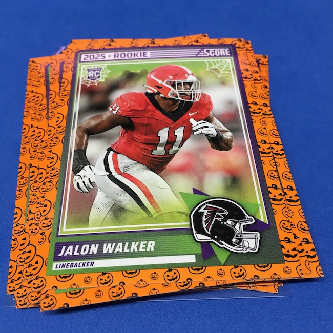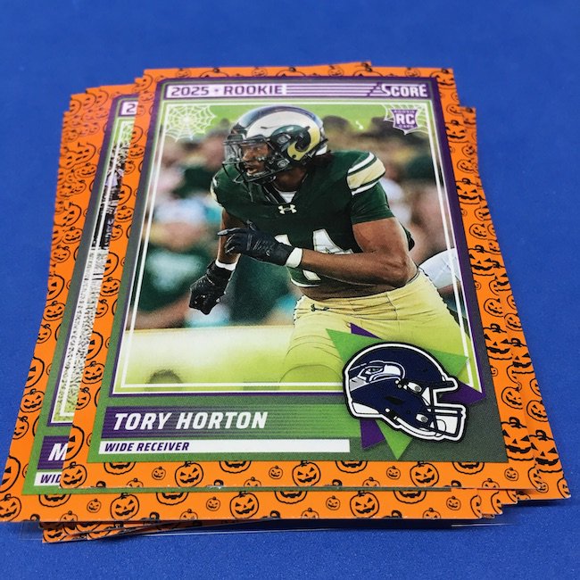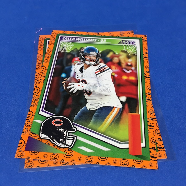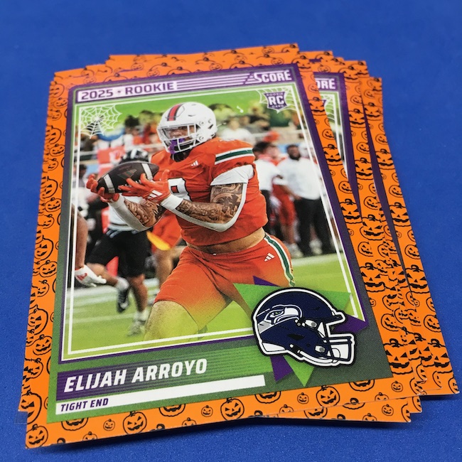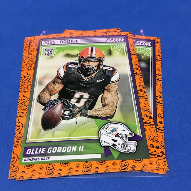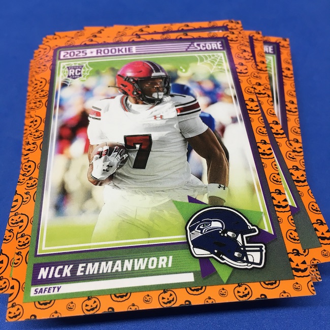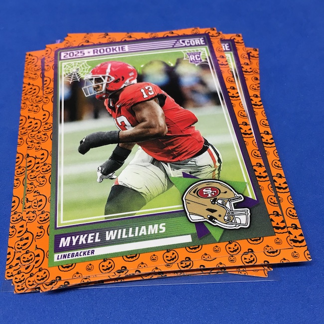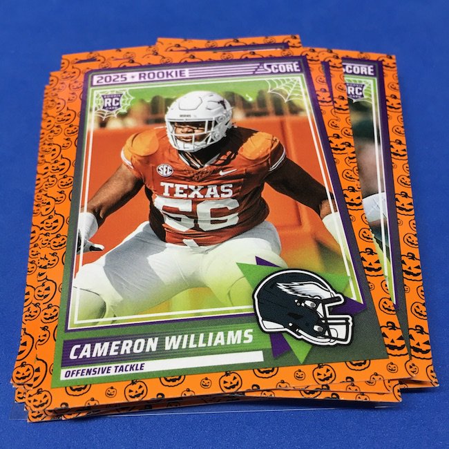 What's Buzz-worthy: My second and last tray of this one? A missing pack ... and that's atop the dramatic changes that made this one a lot less fun to even look at this year. So, with that said, here's what I said last time. ... This candy alternative for Halloween is, in some ways, dramatically different than last year, which will make this a dull break if you opt to open one of these $20 trays expecting a chase. Gone are a pair of set colors in every pack with everything here the same this time -- orange pumpkins -- while other parallels are now serial-numbered with three types. Those are Bats, Trick or Treat and Webs with the easiest /399 and the rarer ones /31. The issue? It's one in 125 packs for a parallel card -- or one in four boxes. Atop that, it's a 300-card base set and 100 rookies ... so your odds of a good name on a parallel are not easy if you do land one. What does that mean? Well, if you do land a good one you might get more for it ... but these boxes are not fun to open at all if you like any kind of variety. And, I guess, technically, this isn't one built for the traditional collector -- it's for Halloween -- but with box prices for even basic stuff like Score relatively pricey this kind of budget-minded rip alternative really isn't drawing me in at all like it should and did last year ... I suspect I might not be alone. A good thing here is that the cards are on the more typical Score stock and are glossed -- unlike last year's really basic feel. There being no chase in most boxes, well, that means you'll see just one more rip of these from me (I ordered two) and that's it until these hit the retail discount bin along with the candy in November. I'm not sure why the inserts needed to be numbered or rarer here ... and does that one extra step really cost so much that they need to be as rare as they are? This would be really fun with five or 10 parallel types and something from those seeded into every pack ... or even last year's approach with more numbered stuff added if they want to add value. I may not rip a lot of football going forward -- from any company -- as stuff like this just doesn't seem to make sense atop the here/coming licensing barriers of teams and players you may or may not find. Adding autos adds costs ... adding some parallel colors and sheets costs less. Rather than dabble, I may pick off singles that jump out at me but that puts this one in competition with anything and everything out there among the sea of singles ... meanwhile, this should be an easy "I'll try it" rip where I buy more than I should if I think it's reasonable that I'd find something, anything more than the basics. If finding any parallel of any guy is one in 125 packs, then I'll let you do the math for what it takes to find one of any of the 400 players found here.