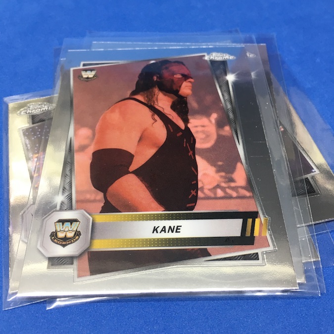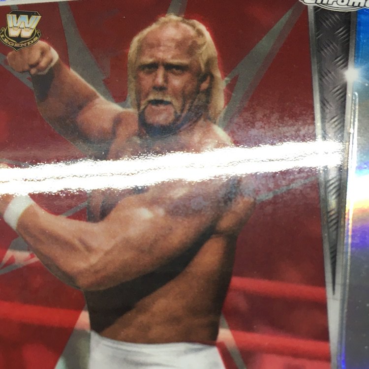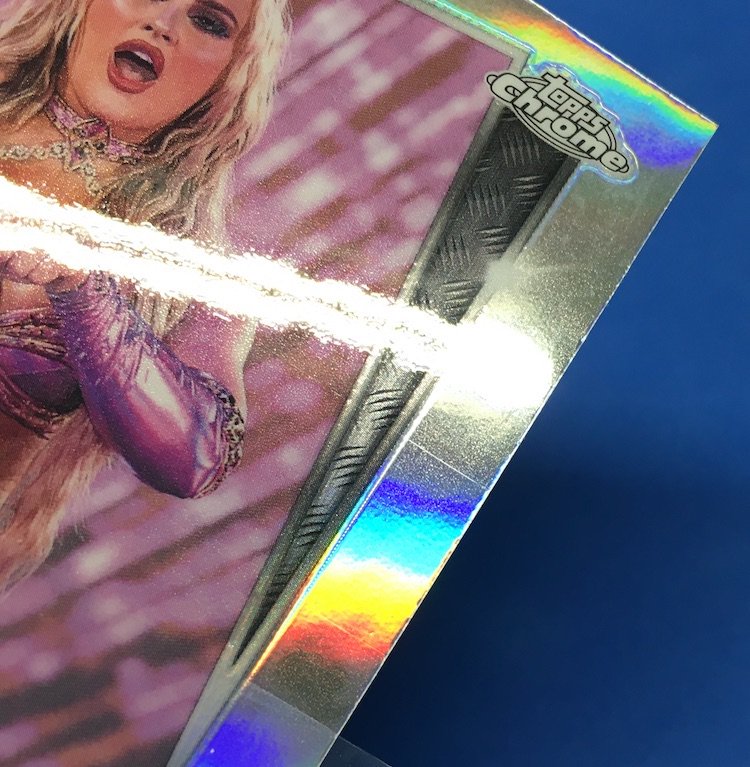 What's Buzz-worthy: Topps returns to the ring for the first time since 2021 thanks to an early licensing change and arrives with a landmark Chrome release that includes some of the biggest autographs possible in the modern era of wrestling -- The Rock for starters and The Rock and Steve Austin on one card in particular as a Mega Powers-style chase atop Superfractor ink -- along with an absolute mess of parallel action, easy inserts and rarer inserts found on the case (and rarer) level. In short, it's a massive package of stuff -- perhaps too much when it comes to the autograph lineup depth -- but the only things that will hold this one back at all might be some production issues and then the secondary market cost of entry as many want their shots at that rare ink and other colorful finds only found in Chrome. This box? It delivered close to the standard kind of stuff with the rarest card being, oddly, the autograph that's not as rare -- they're either spread out across more formats or have fewer names on the checklist and that makes that Red auto one in 157 hobby packs vs. the rarer Blue auto at one in 89. My rarer insert parallel was one in 106 packs. The only real negative here -- and I have seen rougher results -- is the production. Centering seems to be an issue often even with the irregular, slightly asymmetrical design and there are light surface scratches across a lot of card fronts for both base and parallels (see the Stratton close-up at the end of the gallery to know what to watch for) but, most disappointingly, one parallel here seems to be quite sweaty based on my pair of boxes. All of my Red & Blue Refractors had very heavy "sweating" within 15 minutes of going into penny sleeves -- far more than any other cards. Perhaps these sheets didn't dry long enough when the plastic layer was paired with its paper backing? The Pinks and some Refractors also had very minor sticking but not the kind that leaves this kind of funk on the surface. See the Hogan closeups at right and in the gallery below. I grabbed a pair of these boxes and, generally, it was the mix that worked well here for the spend, though I could have done better. (I don't often spring for larger box formats these days but ... I did it for The Rock, I did it for the people.) My second box was similar and it will be in the #Buzzmania8 box breaks marathon before WrestleMania on April 18 right here on The Buzz. Below, you can see every card from this box and I'm sure I'll have more to say once I rip into some other formats of this if they present themselves to me. Ink and rarer chase cards can be found in all formats, though obviously with some long odds for those landmark cards ... but if you rip into them here at least can say you you have a shot.
