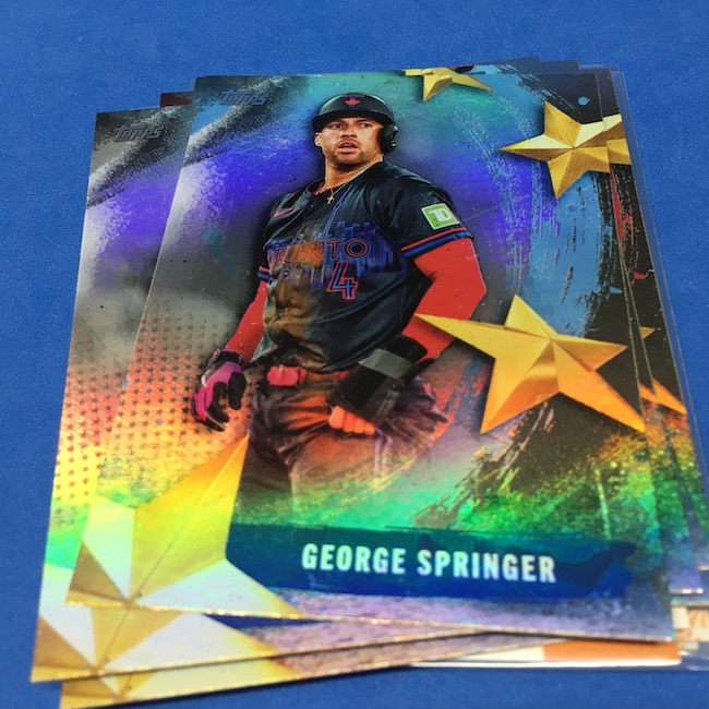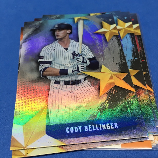 What's Buzz-worthy: My hangers felt more like bangers vs. this one as this one was, well, pretty dull except for the fact that I landed almost twice as many inserts and more than double the RCs ... but even that wasn't very fruitful for top names. The Cardboard Gods wanted me to like this one with the parallel card of the guy I collect here, Bo Bichette, but those are every other box here. The biggest pull was a card I almost missed -- the 1990 insert with the pink background that's one in 508 packs. Asking prices on eBay are under $8 ... so I'm sure they're missed or the odds aren't seen. The Holiday parallels in this format are can't-miss cards visually but I think I prefer the hanger exclusives -- actually, I know I prefer those over these. The rest was pretty much the same standard stuff with more volume on the retail-only Stars of MLB, too. ... As I've noted before, the foilboard effect is back on every single card but instead of going dark on the borders it's a mash-up of 1982, 1984 and 2019 with a light modern look this time around. Does it work? Yes. ... If you like what you see, rip into jumbo for your best results with a guaranteed autograph and Relic and maybe more.