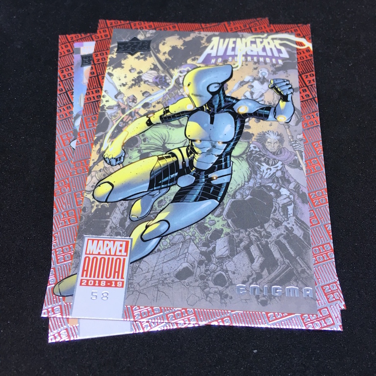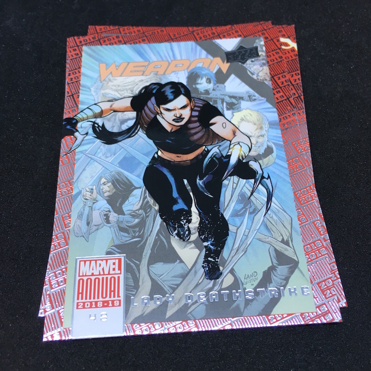 What's Buzz-worthy: This new potential find at retail is a super-cheap one -- just $9.99 -- and it seems like there could be some potential here but ultimately it left me a little confused this time. The labeling of what's in them seems like you should get at least three items -- but I'm not sure what's what here or whether this box was a bonus-item scenario. (I just grabbed one off the shelf -- I might have tried a couple had I realized they were this cheap.) The packs here were on the uneventful side. I opened the Deadpool VS. gaming deck and was a little confused by what I found -- several copies of several cards -- but I think the tiered cards shown in the gallery are the highlights. With the potential here for autos, sketches, memorabilia cards and more it seems like tire's some potential to be had here for the price, though there are a lot of sketch cards and autos that you can find for under $10 these days. The mystery factor got me to look ... and I'll probably do it again.