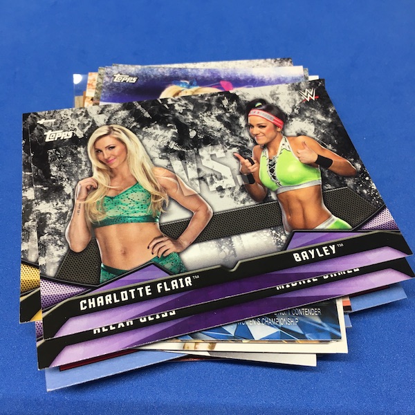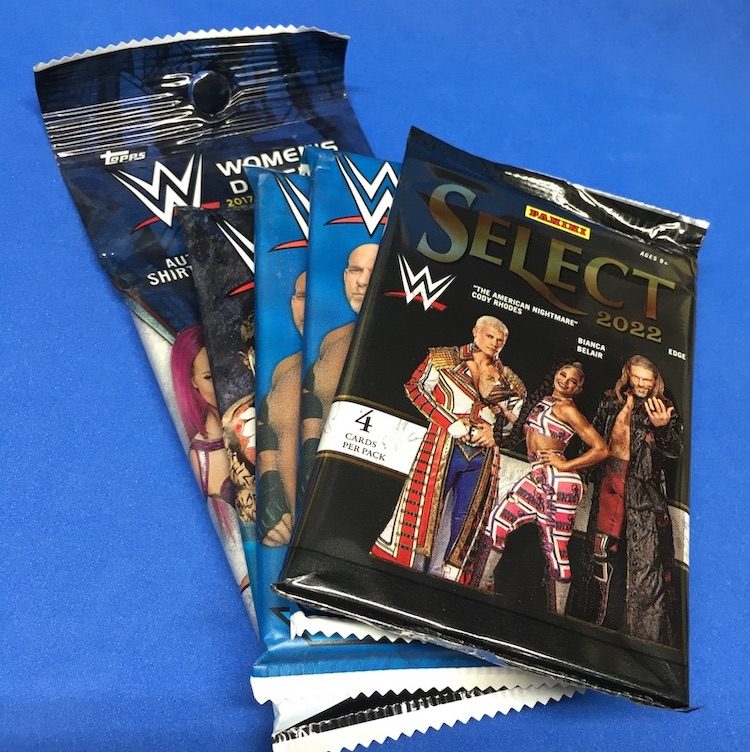 Box 2 -- One 2022 Panini Select WWE retail pack, two 2017 Topps Heritage WWE retail packs, one 2017 Topps WWE Series 2 retail pack, one 2017 Topps WWE Women's Division value pack (five packs)