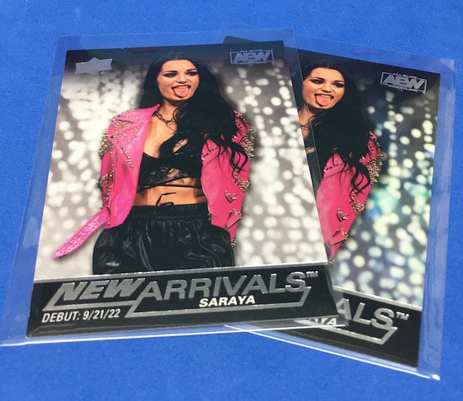 The Cards: Saraya 2022 UD AEW New Arrivals & Silver parallel, 2022 UD AEW Match Dated Moments (five copies)