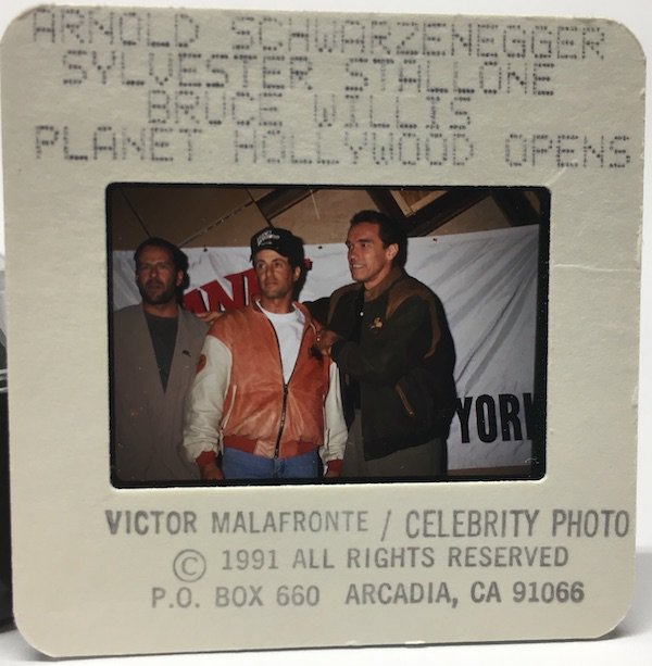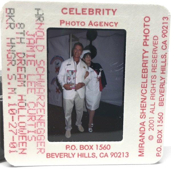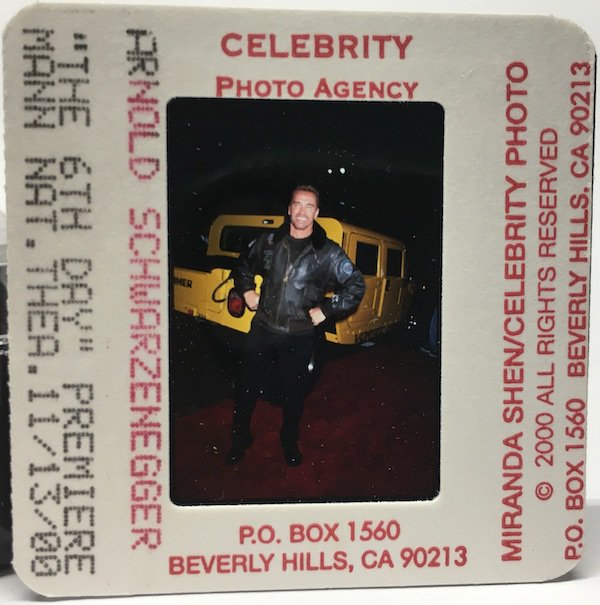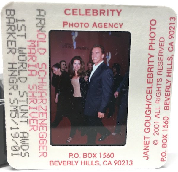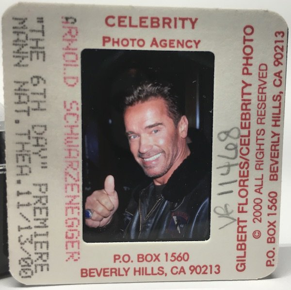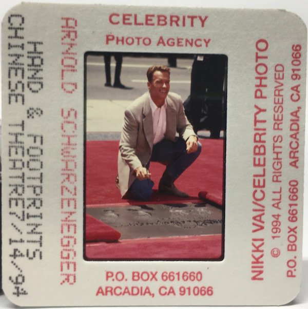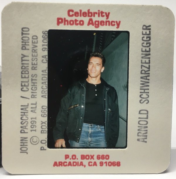 The Card: Arnold Schwarzenegger assorted Celebrity Photo Agency slides (with cameos from Sylvester Stallone, Bruce Willis, James Cameron, Maria Shriver and Jamie Lee Curtis)