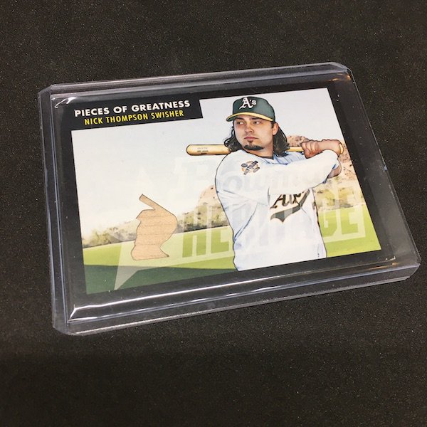 The Cards: Nick Swisher 2011 Topps Allen & Ginter Framed Mini Relic, 2007 Bowman Heritage Pieces of Greatness Black (/52), 2014 Panini Immaculate Collection Diamond Fabric (/99) & Immaculate Hitters (/79)
