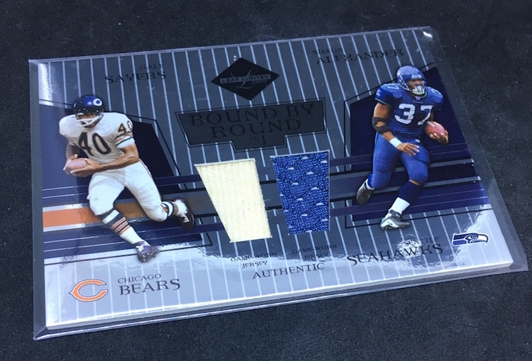 The Card: Gale Sayers & Shaun Alexander 2004 Leaf Limited Bound by Round materials (/50)