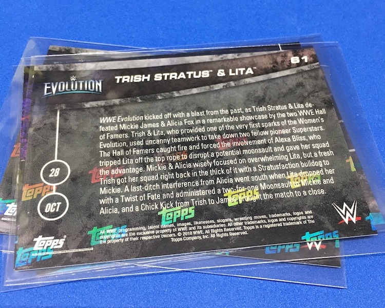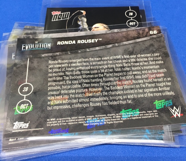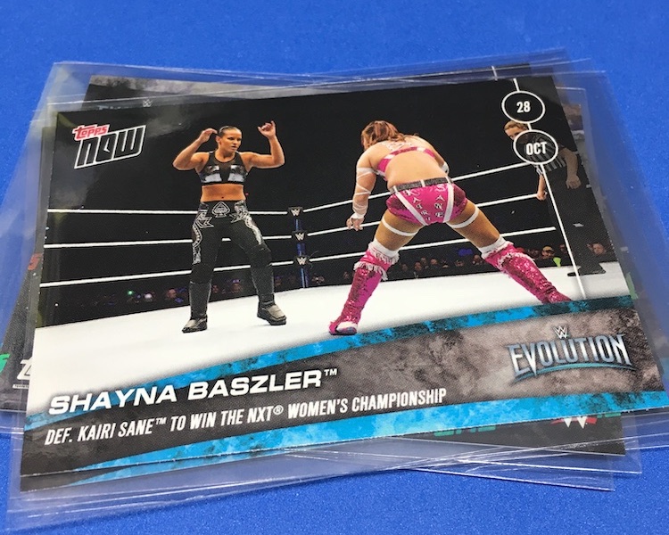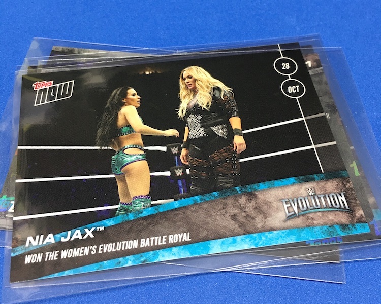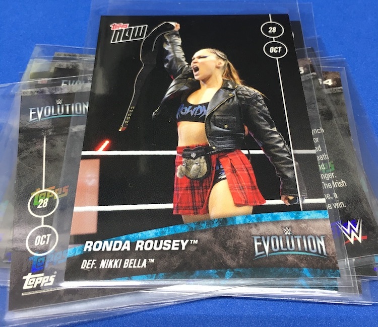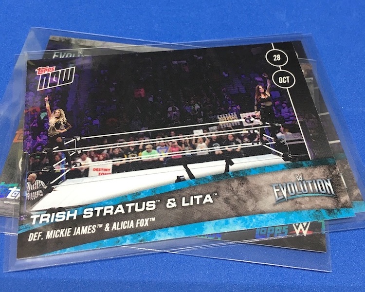What's The Deal? With chatter about this past landmark event in WWE history -- Evolution was the first women's-only pay-per-view and still is -- out there today online, I figured I'd pop these up here for a little #TBT but also to show how some key cards are out there from the defunct Topps Now WWE line. These are nowhere near the rarest Now WWE cards -- some had well under 50 copies printed for a number of names more-notable now -- but they are some early appearances here. Here's the rundown and their print runs: