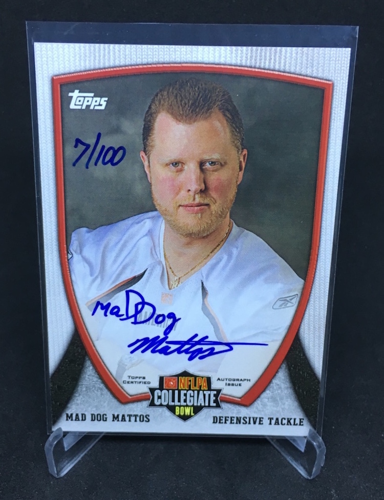 Why it’s Buzz-worthy: This name may not be a familiar one but you likely own some of his work. Back when this one was made, Mattos was on the Topps squad as an editor on its football team helping make it all happen. These days, he's switched leagues and now works for MLB last I saw. This one came from a college All-Star event where players signed their cards -- about 90 signers in this one -- with Mattos at the end of the checklist. With a sig like that, this one has to qualify as an oddity ... right?