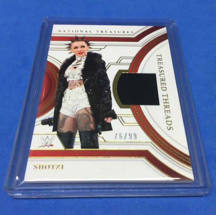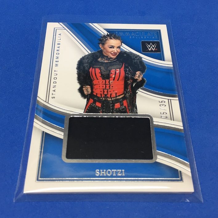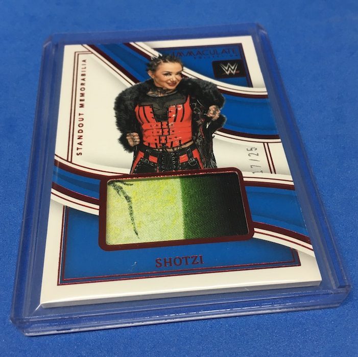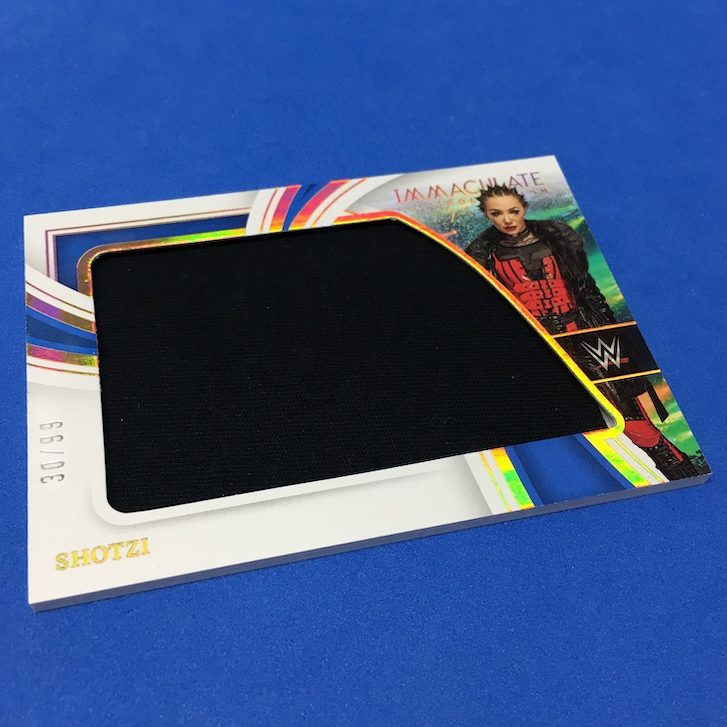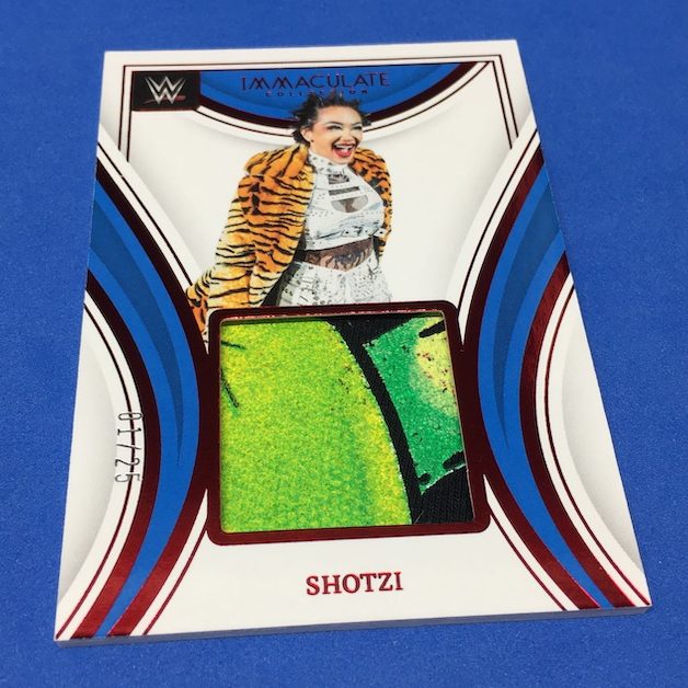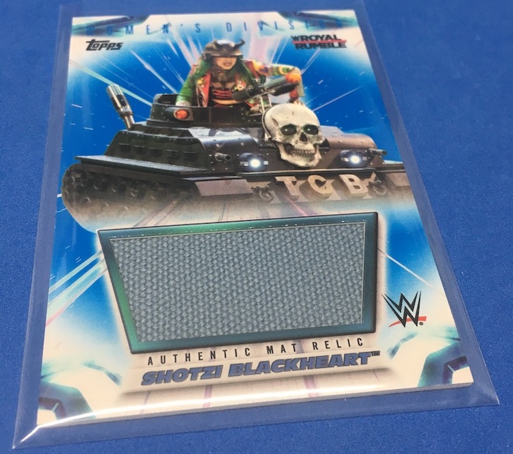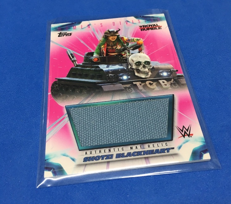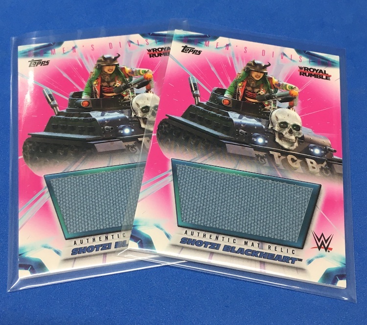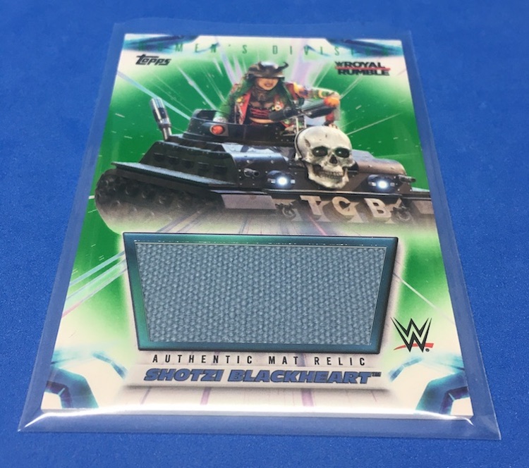 The Card: Shotzi Blackheart 2021 Topps WWE Women's Division Mat Relics Blue (/25), Green (/50) and three Pink (/150)