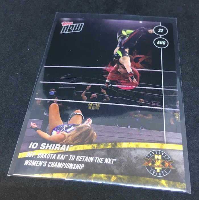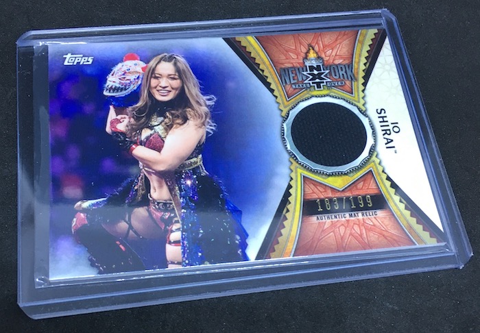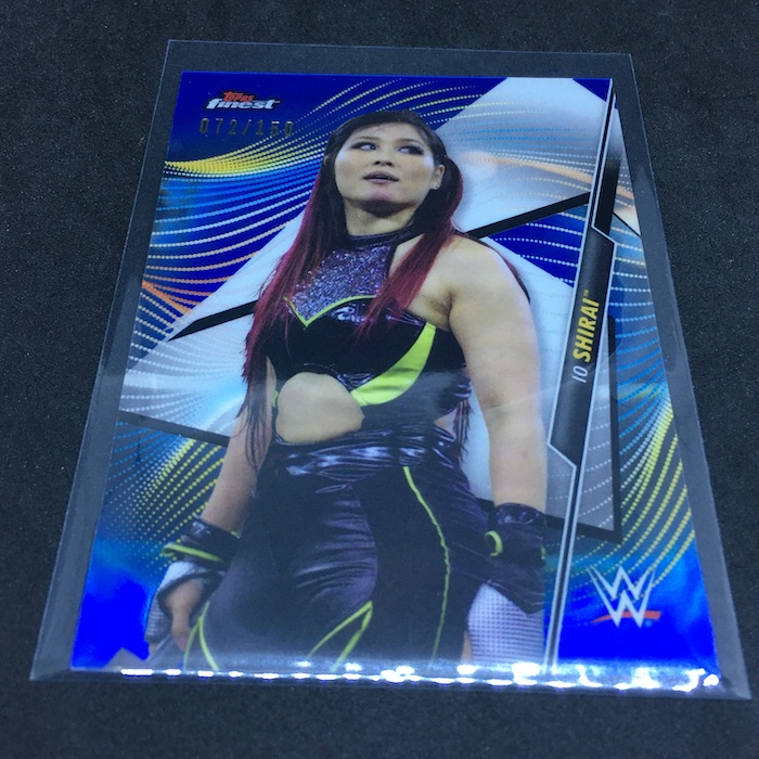 The Cards: Io Shirai 2020 Topps Now WWE (/96), 2020 Topps Finest Blue Refractor (/150), 2020 Topps WWE Road to Wrestlemania Wrestlemania 35 Mat Relics (/199)