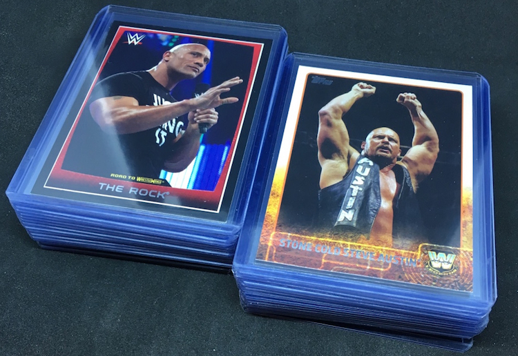 Why it’s Buzz-worthy: My info on this one isn't complete and the cards are tucked away in a box somewhere all these months later, but sometime in the middle of last year I happened upon a lot of WWE cards that looked rough (if not downright junky) ... but I noticed some cards I didn't recognize and had to grab it. While a few cards in the lot (regular cards that were in rough shape) went straight to the trash can, it turns out that more than 40 cards in the lot were Topps promo cards found only in WWE DVDs. Some of those were originally packed in clear wrappers placed in the DVD cases while others were simply dropped into the CD boxes loose letting them bounce around like they're Ricochet in a steel cage match but without any pads on. For modern cards, that's a bummer -- most are Excellent condition at best and some worse -- but the lot is strong overall. Some of the biggest names like those you see here are razor sharp because they were released in wrappers. Long-term, cards like this could be strong in future years, though their conditions will always be problems. Typically they were one card per DVD ... so that was a lot of buying for somebody to put together the lot.