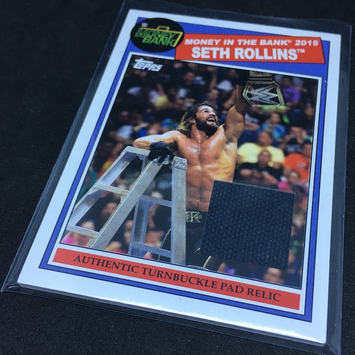 The Card: Seth Rollins 2015 Topps Heritage WWE Money in the Bank 2015 Turnbuckle Relic (/25)