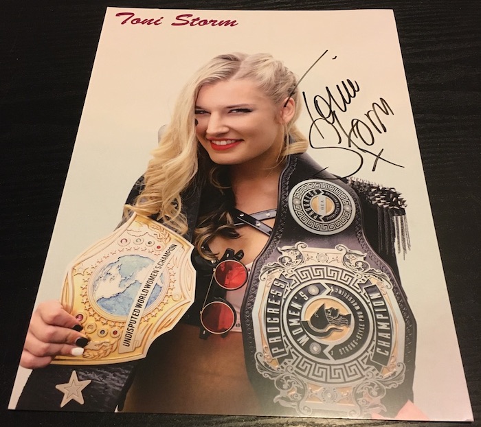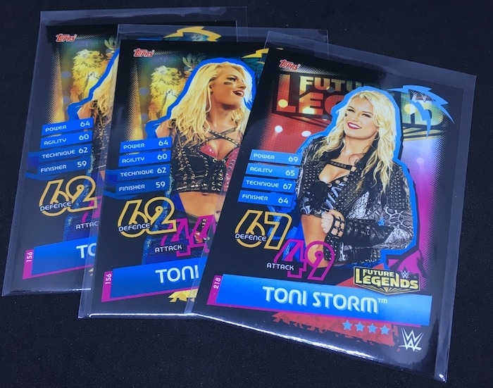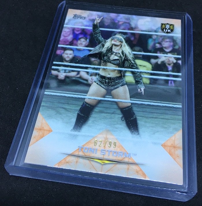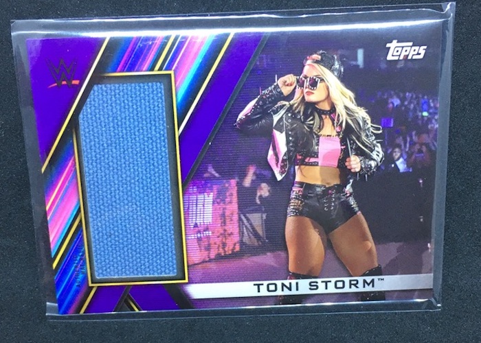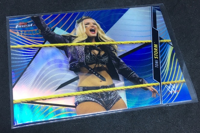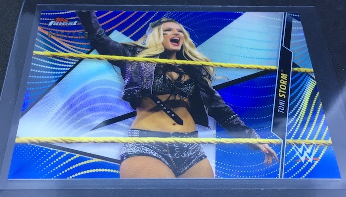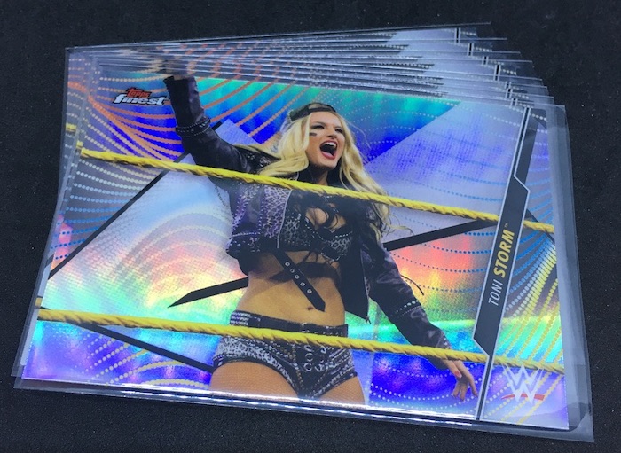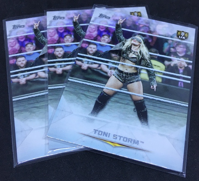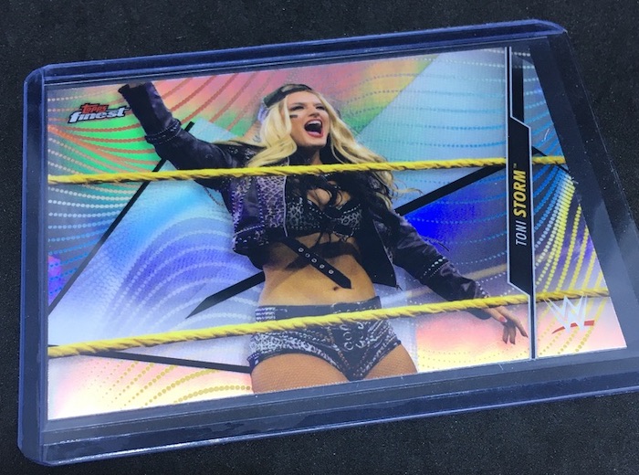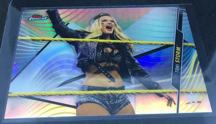 The Stuff: Toni Storm Stardom (Japan) signed promo photo, 2018 Topps Now WWE debut card and then various 2019 and 2020 Topps Attax, Undisputed, Finest Refractors and Women's Division cards.