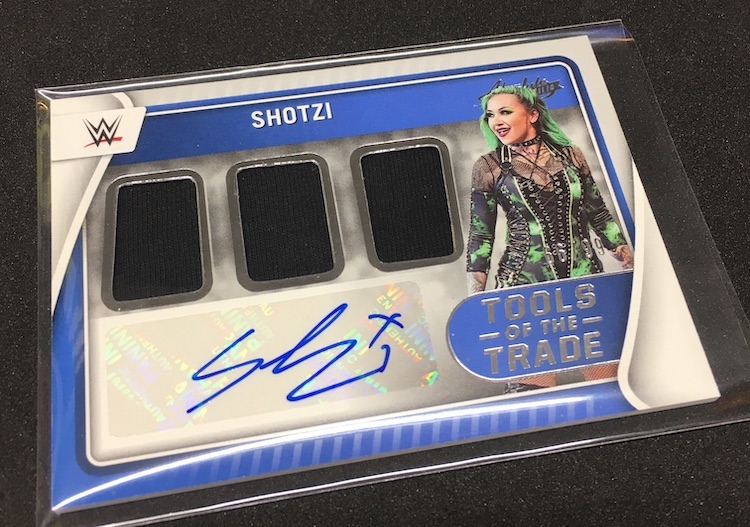 The Cards: Shotzi Blackheart 2022 Panini Impeccable WWE Elegance auto-mem (/99), 2022 Panini Chronicles WWE Absolute Tools Of The Trade auto-mem (/99), 2021 Topps Finest WWE Green Autographs (/99), 2022 Panini Select WWE Signatures