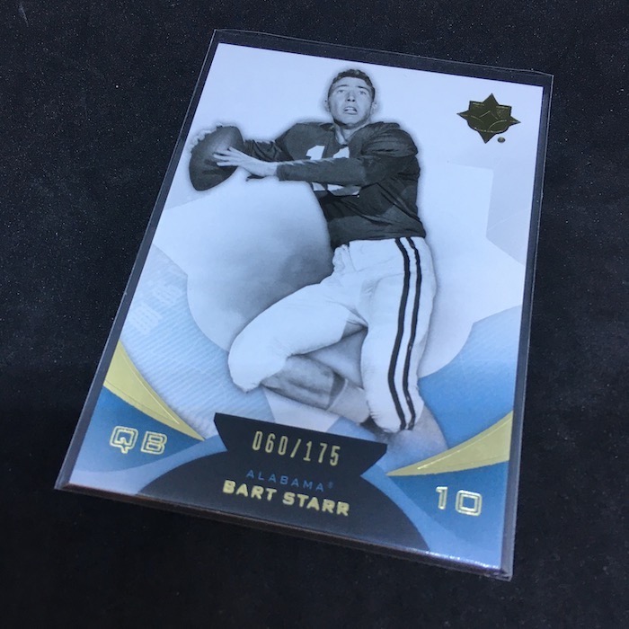 The Cards: Joe Namath 2016 Panini Black Gold Collegiate (/99) & Bart Starr 2013 Upper Deck Ultimate Collection (/175)