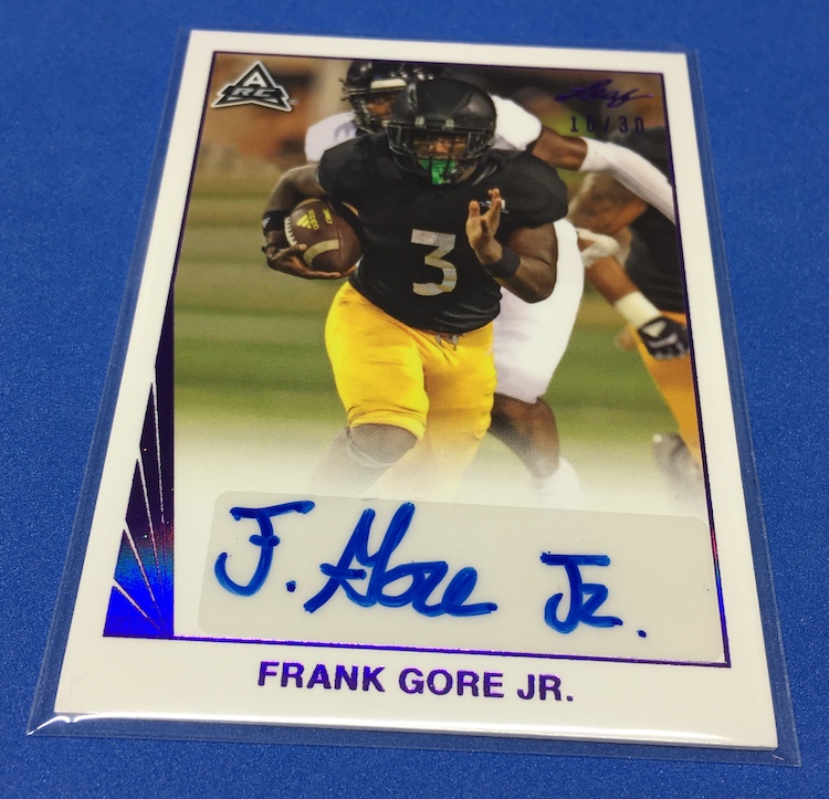 The Card: Frank Gore Jr. 2021 Leaf Memories 1990 Purple Spectrum Autographs (/30)