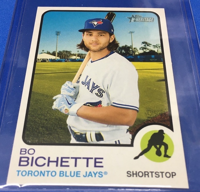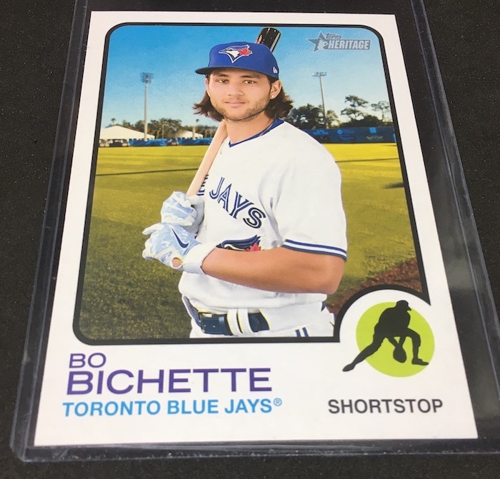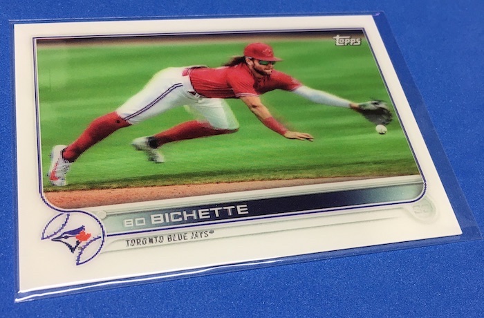 The Card: Bo Bichette 2022 Topps Heritage Mini (/100), 2022 Topps Heritage jumbo box-topper (announced /1,000) & 2023 Topps 1988 Topps League Leaders box-topper