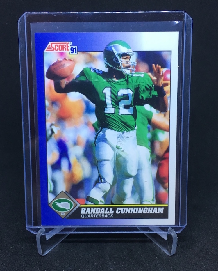 Why it’s Buzz-worthy: This card isn't accidentally in a top-loader and it's not a 10-cent card from a 1,000-percent forgettable third-year release for Score NFL, either. It's actually an early sample card made to promote the set that is easily noticeable in that the blue here is on the left when it's appears on the right side of the standard card. The card back has other small differences with the photo crop (the photo slides to the side a bit) and other stuff you wouldn't notice unless they were side by side like the trademark on one of the logos and some text coloring. I picked this one up because I think the really rare promo stuff from around this time -- I didn't even know this existed until recently -- could pick up steam since they just can't be anywhere as plentiful as the standard stuff. Just six cards were done for this -- Joe Montana, Lawrence Taylor, Derrick Thomas, Mike Singletary, Boomer Esiason and Cunningham.