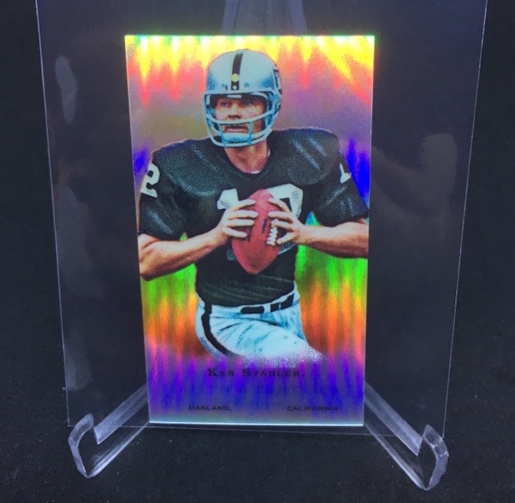 Why it’s Buzz-worthy: eTopps tried some things in the past and this holofoil take on oldschool Allen & Ginter tobacco cards is one of those things that it didn't do often. I picked this one up mostly for its bargain price for a Hall of Famer but also because I like Ginter and this is a card with a photo that has one of those weird details I always look for on Stabler cards. You can't see it all that well with the Ginter treatment, but, yes, that's a smiley face sticker on the stripe of his Raiders helmet. (You can see it a little better here.) This isn't its only time it's seen on cards, either. I don't remember the story behind it but it's always one of those minor Easter egg things I look for. Why? Just for fun.