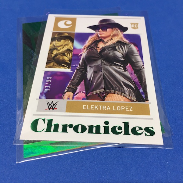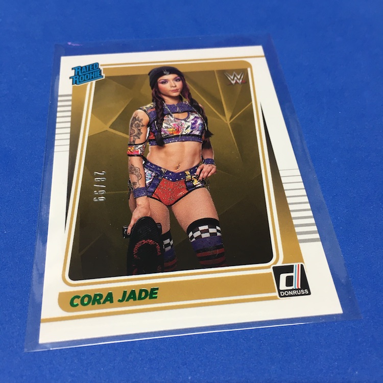 Card That Stole The Show: This Cora Jade RC parallel would have been bigger at release, but she's had ups and downs due to injuries that have taken time away from the ring and TV. Of the parallels here, this still is probably the best card in both the here and now as well as a card with some upside, though its centering could have been better.