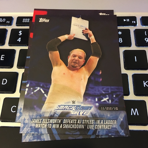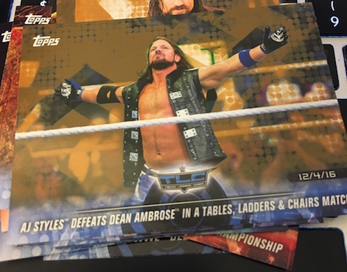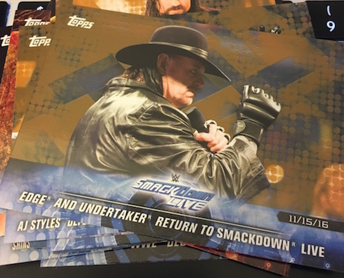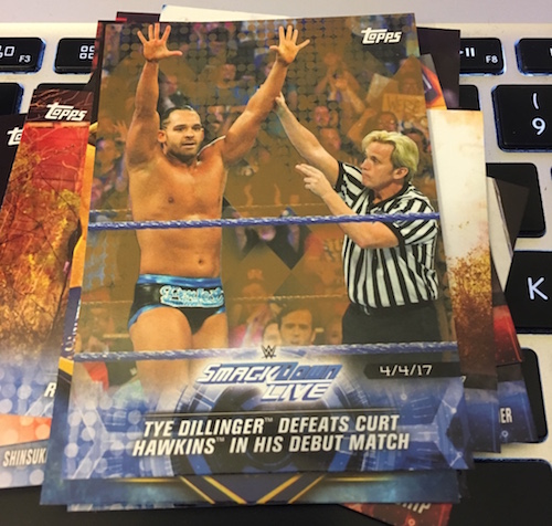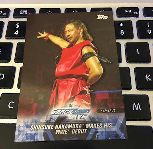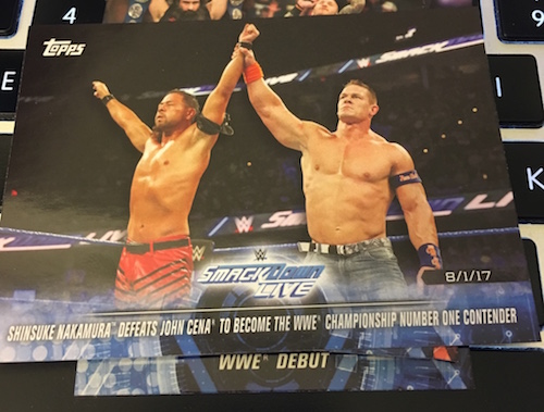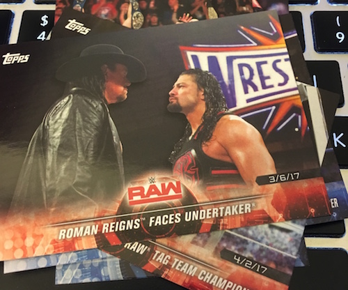 Notables on base cards – Shinsuke Nakamura, Roman Reigns, Undertaker, Ricky Steamboat, Braun Strowman, A.J. Styles, John Cena, Elias, Mick Foley, Triple H, Stephanie McMahon, Chris Jericho, Randy Orton, Goldberg, James Ellsworth, Finn Balor, Brock Lesnar, Tye Dillinger, Jinder Mahal, Charlotte Flair, Kurt Angle, Bray Wyatt