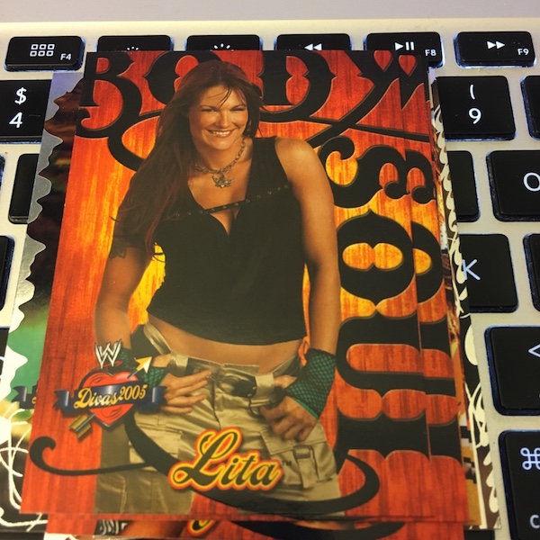 What's Buzz-worthy: Fleer released just three WWE sets in its final year of making cards before it closed its doors and this was the finale from late in 2004. It's our finale for this year's #BuzzMania break, too, and it delivered pretty well. This is a simple lineup -- you see all the inserts here and the only thing you don't is Body & Soul on the memorabilia front (one in 288 packs) and then two autographed sets, Hugs & Kisses (/15) and With Love (/5) autographed memorabilia cards that are very tough pulls. Everything delivered as it should odds-wise in this box and there was a complete set in this one -- that's about all you can ask for. The base set is made up of standard cards with a mix of studio portraits, in-ring action and photos from other on-location WWE photo shoots at the time. There are 52 standard cards, 13 Catfights cards and then  14 Opposite Sex cards and then it's all capped off by a Babe of the Year Trish Stratus card. This set is among Fleer's best for a simple design that showcases strong photography and it's printed with some spot gloss and selective use of foil -- all in all a very solid release, though the ink wasn't flowing as well from boxes compared to previous releases. This was the last women's-focused product for WWE until 2016 when Topps released its Divas Revolution set.