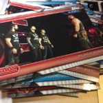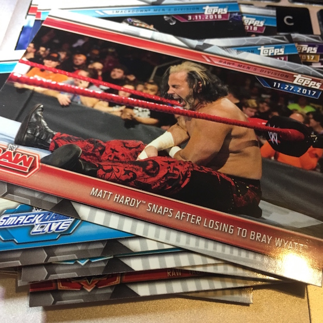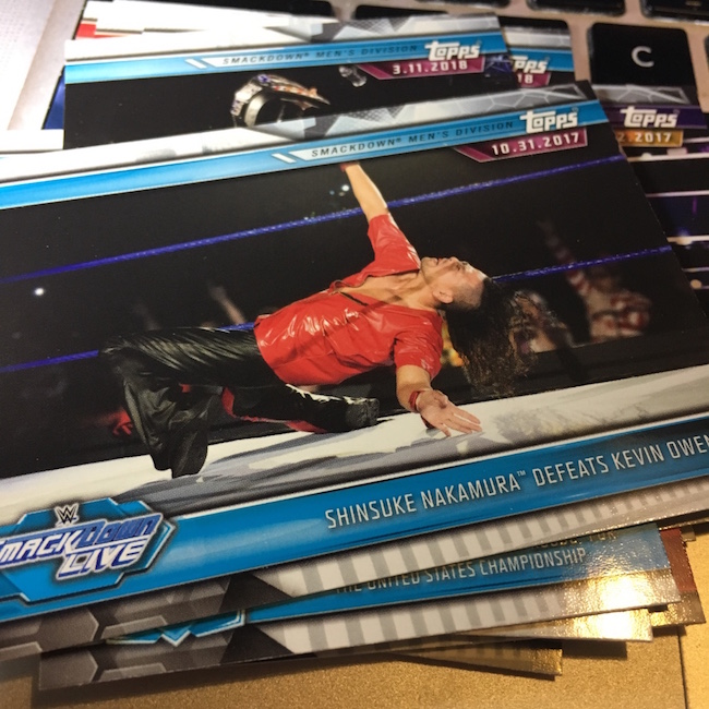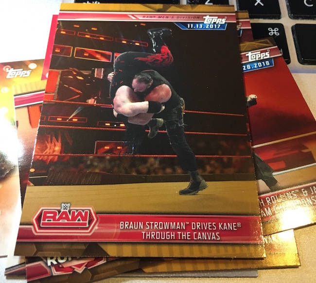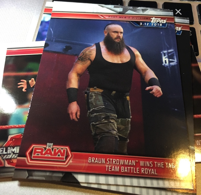 What's Buzz-worthy: This is the newest WWE release out right now (though a new one is scheduled to arrive soon) so it gets a break here. The hit here is of a star some fans really like though I'm not that sold beyond his present gimmick. ... As said before for this one, the format here is similar to recent years with this being a clean highlight set recapping the previous year as WWE marches toward WrestleMania. The base set of this one has been stripped of all women's moments save for two of Ronda Rousey. (The highlights from that wide likely will be in the women's set later this year.) ... The hobby boxes seem to be delivering parallels among the hits and elsewhere well -- you get at least one autograph per box every time there -- so that is your safest bet on that front. These boxes deliver Kiss Cards and Andre The Giant Battle Royal metal cards easier then hobby if you want to chase those. There are some strong photos to be found in this one and there are plenty of moments and personalities to find among the inserts. (There is some repetition of moments in the base set, though.) The parallels are bold and easy to find this year -- something that didn't always work last year -- and the design is refined and clean on both the fronts and backs overall. It's not the flashiest brand but it has improved in recent years -- I just have a tad different wants than what this one presents.
