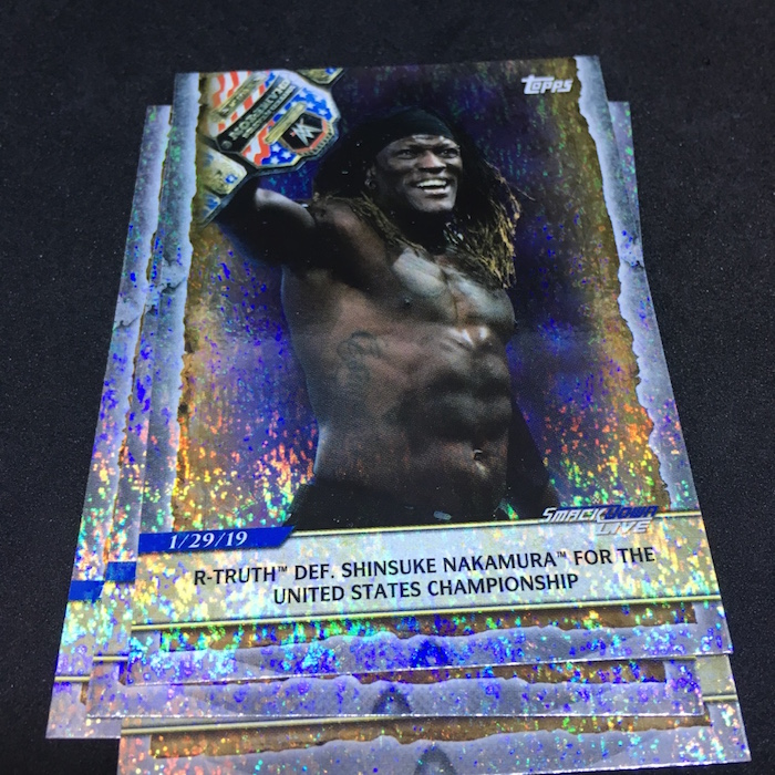 What's Buzz-worthy: Hits-wise, this box was a big winner with the Relics -- the rarer one here checking in at one in 833 packs and the ink at one in 198. The hits are by far the biggest highlights in this one as generally speaking I'm not the biggest fan of the highlights format after several years -- but it leads off here as the first new WWE set of the year. As said in my previous break, it keeps things simple visually without becoming mundane and that helps it improve upon last year. One thing to help mix it up here? Foilboard parallels that jump out of the pack. The Roster cards feel more like a base set here -- 50 cards -- and are also improved with stronger photos in many cases that are more portrait moments from action (in-ring or entrances) compared to the studio shots with an overwhelming backdrop last year. ... I still think the main set would be better with the women's and NXT highlights all mixed in here -- let those main sets take different approaches -- and that would help out this one a ton. All in all, this one is comfortable but not super-flashy -- and it is stronger than a few of last year's WWE releases design-wise.