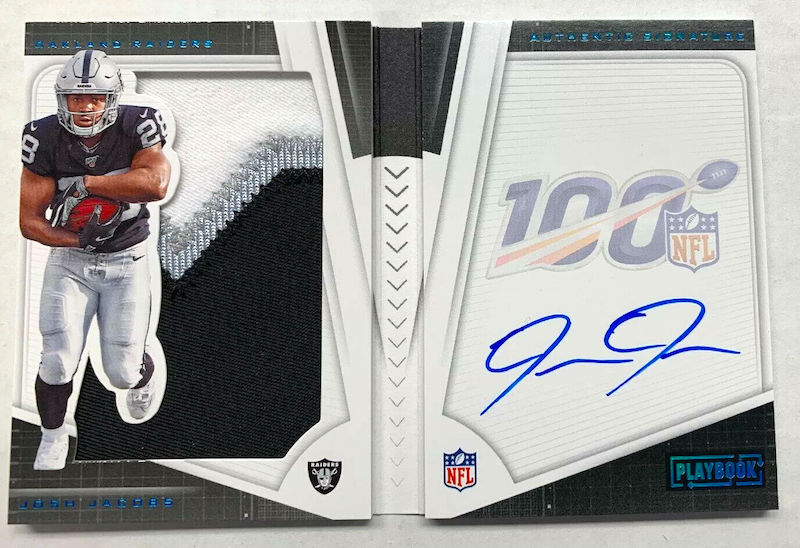 The Card: Josh Jacobs 2019 Panini Playbook rookie patch auto booklet (/49)
