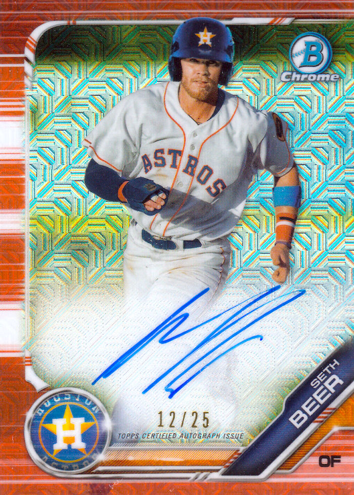 Buzz’s card take: Almost half of his cards are certified autos and that means you all have plenty of chances to play the "hold my Beer" game out there ... as long as you pay up. He's got a ton of cardboard with USA Baseball and Perfect Game releases but his Chrome ink is limited ... so far only in the Bowman Mega Boxes. He should have more to come soon. I don't see a first-rounder from last year being as potentially disposable as it makes it sound above since he has 19 homers and a .323 average this season -- both improvements over last year. He's a name you should know for cardboard given the Astros' talents.