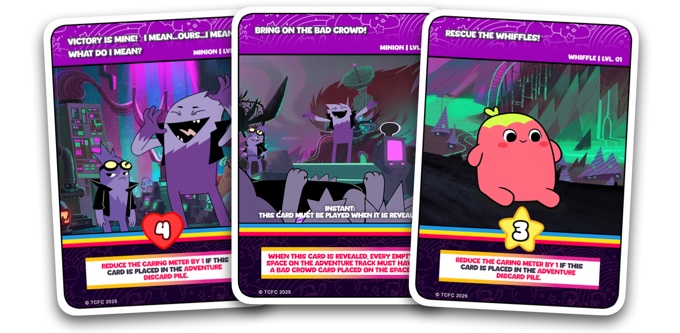 The core game includes 80 Care Bears cards, 60 Adventure Cards, 40 Tokens, a Caring Meter, a folded playmat and an instruction booklet. All that can be built upon with booster packs and boxes that have various tiers and some chase added. Boosters will include a sampling from a lineup that includes 108 cards with Common, Uncommon, Rare and Epic Holofoil cards that will be found just five percent of the time. And only 10 percent of the Holofoils will be Legendary Cards, which will be the rarest chase in this game. See all the details in the gallery below.