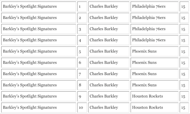 Barkley's presence on the Noir checklist is now known as he'll have a 10-card Barkley's Spotlight Signatures set in that product with each card limited to just 15 copies and his three NBA teams represented.