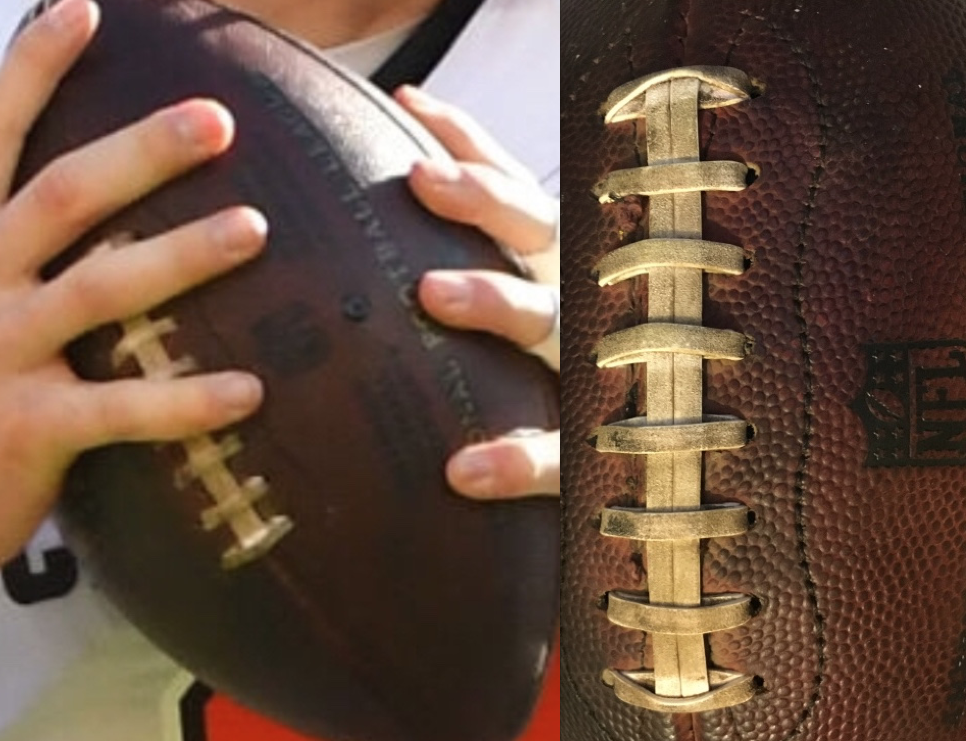 Unlike the Chubb photo, the original Mayfield image up top is from the third quarter, so they are proof that the balls get cycled into play throughout the game -- as long as they aren't fired into the stands. These photos can help show the evolution of balls, too, as the scrapes and damage of gridiron warfare add up over time. My ball can be matched in a few other images besides the two you see here, but that's not all. Numeric matching is the easy way to match. A closer look at my ball's laces in other photo on the Getty app show the irregularities unique to my piece that can also be matched. The example above shows how they're moved and dirtied -- even a spot where there's a chunk of brown leather hanging out in one spot. It's not necessary to seek out details this intensely unless you're trying to decipher whether they were used for touchdown plays. (I don't think that's the case with by ball ... but I can't prove it wasn't used for a TD, either.)