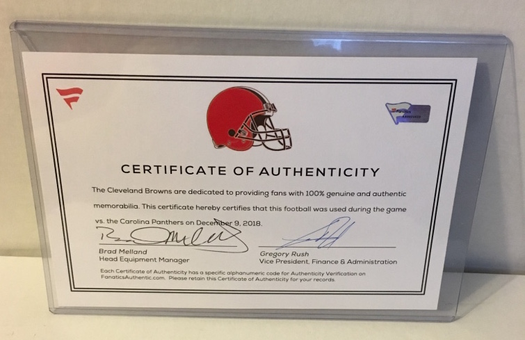 The football you see in Baker Mayfield's hand in the photo above? It's the same ball you see here and I landed it for a relatively pricey but not ultra-expensive sum from Fanatics -- about the price of three mid-range NFL boxes or a one-third share of a single new Flawless briefcase. It's one of just two balls that the company received from the Cleveland Browns for their Dec. 9 game where they hosted the Carolina Panthers and won 26-20. Mayfield completed 18 of 22 passes for 238 yards and a touchdown in the game, while Nick Chubb ran for 66 yards and a touchdown on 13 carries.
