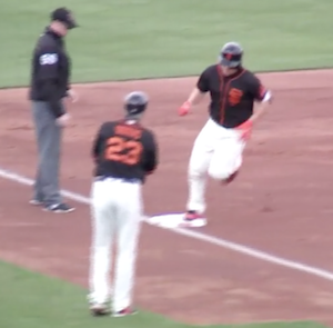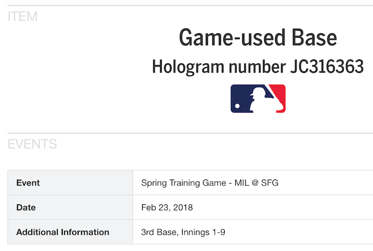 What's Buzz-worthy: I found this authenticated base on MLB Auctions (via the Giants) for the buy-it-now price of $100 -- or, in card terms, roughly the price of a new Topps Heritage High Number box -- and that's a bit of a steal. (Pun intended.) Bases can typically cost between $200-$300 (and often more) from a normal game -- and then MLB shipping costs can tack on some big-league surprises. While other spring bases can still be had for around the same price right now over there, this one was a little different to me after checking the box score. The name that jumped out at me? Keston Hiura, who was the ninth pick in the 2017 MLB Draft but didn't make his big-league debut until May 14 this year. Remember, this is a spring training base from last year. Out of curiosity, I checked Hiura's game log and was surprised by what I saw -- this was from the very first spring training game of his big-league career. Sure, it's not a jersey or a bat from that key game for a key player -- a 22-year-old rookie who's hitting .307 with 14 homers and 33 RBI in 57 games this season, by the way -- but I'll take it, especially for the price. ... Since the base was used for the entire game, it has a number of moments attached to it if those spring things matter to you -- home runs from Pablo Sandoval and Nick Hundley, for example. But there also are drawbacks to Cactus League items in terms of the jewels on the bases (they don't show both teams for these like they would during the regular season) as well as with photo-matching, especially early in the spring. There are only a few quick highlight clips online from this game -- one showing Hundley rounding the bases -- and there's nothing from Getty Images in terms of photography. (So, a photo match with it and Hiura ain't happening.) ... There are a lot of players who played in this game -- more than 50 -- and a number of them crossed third base, but the Hiura debut matters most. If you're wondering, he did reach third in the fourth inning as part of a debut game where he went 2-for-3 with an RBI. If he continues to play well like he has this year, this could be a strong pick-up down the road. If not, at least I got my first game-used base on the cheap -- far cheaper than many of Hiura's autographs are going for these days.