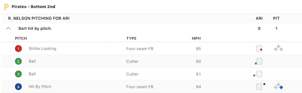 The results: Three no-contact pitches before a HBP that started a three-run inning as part of a no-decision for Skenes. (Bart scored his only run off this appearance as part of an 0-for-3 day.)