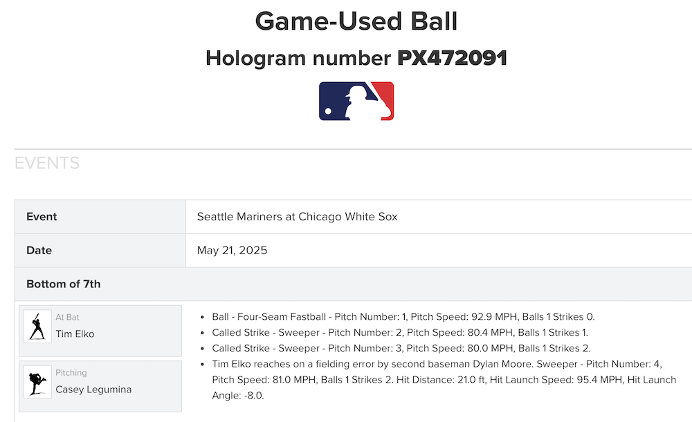What's Buzz-worthy: The Sox are one of several teams that pre-sells baseballs by date during the season and the listings on their MLB Auctions page stay there as long as the baseballs are in stock following the games, too. On a hunch, I cross-checked Raleigh's home run log to the team listings and this was the lone Seattle opponent that had baseballs in stock for a game where big Dumper went yard in his a record-setting season for a Mariner (better than That Griffey Guy ever did) and for any catcher in MLB history. While Raleigh came up just short of the American League record, I knew I'd want to get a piece of this season just because ... so I rolled the dice. I figured there would be a 50-50 shot -- at worst -- of landing a baseball touched by him during the game with him being a catcher and I figured the home team may not care as much about stuff not hit by, or a highlight for, their squad. When I saw Legumina vs. Elko I initially figured I missed, but Raleigh played the whole game and handled Legumina. So then I checked the MLB Authentication listing -- remember, all I knew was the game date here when buying -- and then went to the Film Room to see my new ball was used for the entire appearance from a game where Raleigh homered the inning before. The error was the fifth of the season for Moore (he only has 33 for his career), while this was just Elko's 10th career game and it was the 34th career appearance for Legumina and fifth victory of his career. The only number that matters in this game for this ball to me, though, is that it's from one of the 60-homer games for Big Dumper at a low price letting me collect other stuff, too. He isn't even noted as part of the authentication listing -- but it's all right there on video.