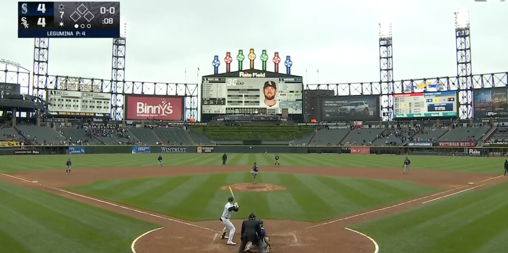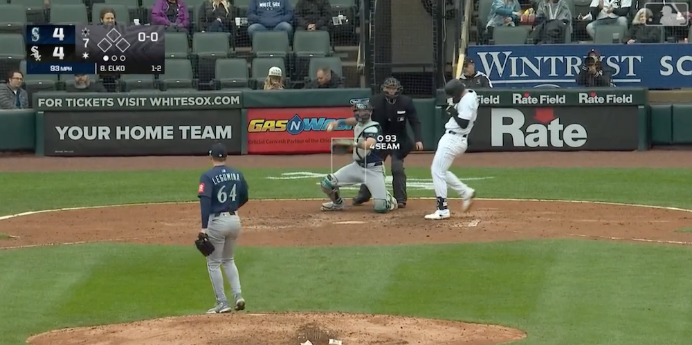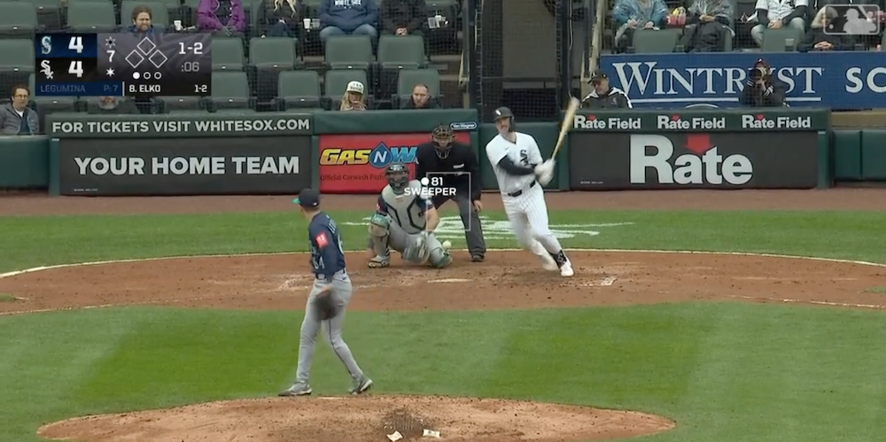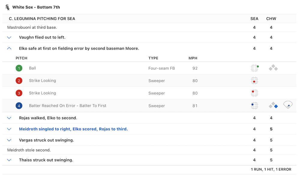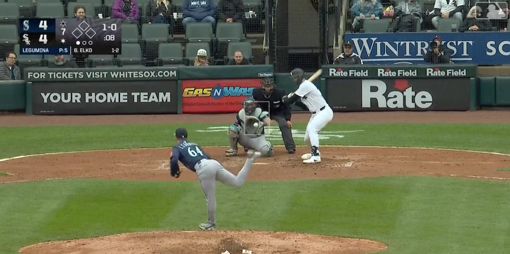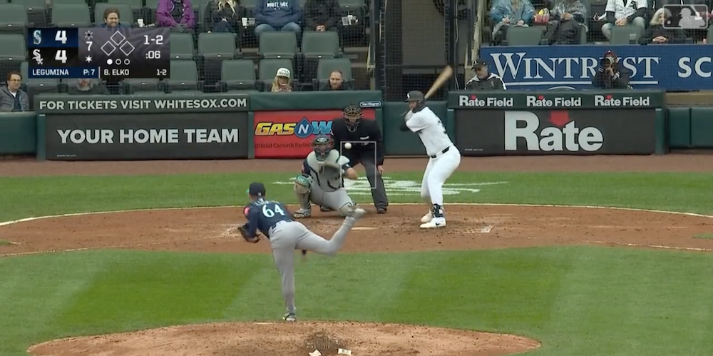 The matchup: Mariners RP Casey Legumina vs. White Sox 1B Tim Elko in the seventh inning of a 6-5 Seattle victory.
