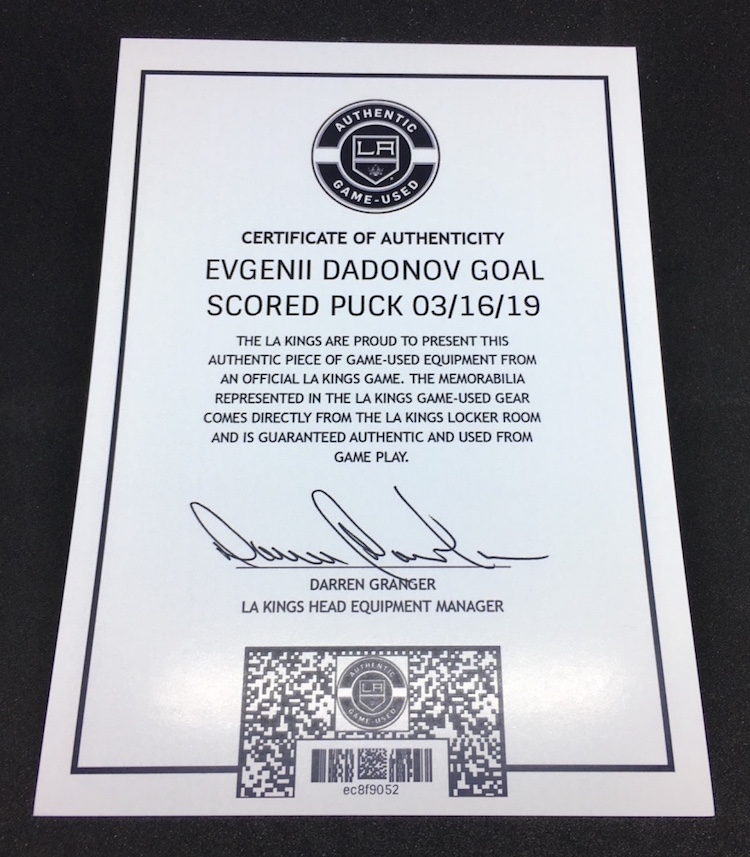 Game-used puck (Fanatics/L.A. Kings authenticated): Florida Panthers vs. Los Angeles Kings, March 16, 2019