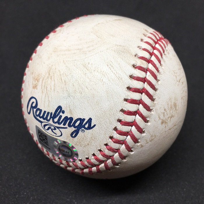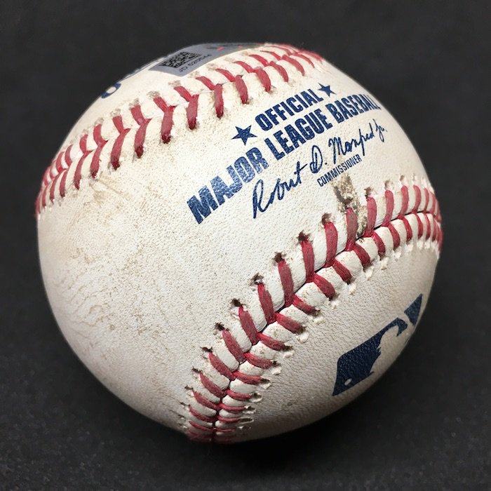 What's Buzz-worthy: This one is among my last balls from a past stashing of a dozen dirt-cheap gamers from Philly (like I said, I couldn't pass at $10 a pop!) and it's one that actually had a little more action attached to it than what was initially teased. The label/listing from the team simply showed "ball" but this one actually was a called strike, a big swinging whiff and a ball in the dirt that bounced off of J.T. Realmuto and rolled between Robles' legs up the line to the grass before being taken out of play. You can see its entire MLB life in the three videos linked above. This game was Robles' ninth of the season (43rd of career thanks to two previous small stints) which saw him finish sixth in the National League Rookie of The Year voting. There really aren't any numbers attached here as two pitches later Robles flew out to end the inning ... this is just a ball with some mild star power and still some mild potential. Robles was a top-10 prospect when he arrived and he's in his seventh season as a 26-year-old -- but the bit where the ball rolls between his legs and they all look down at it amused me. It's the little things ...