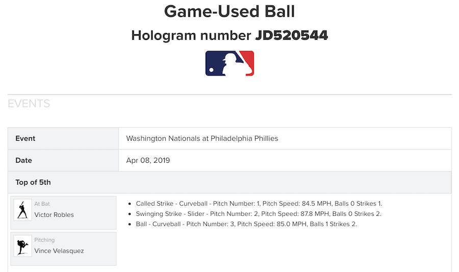 Game-used ball (MLB Authenticated): Washington Nationals vs. Philadelphia Phillies, April 8, 2019