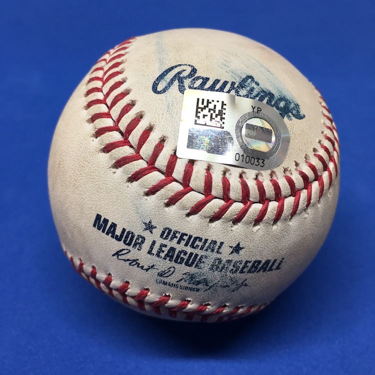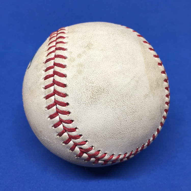 The surprise? This one was used for an entire at-bat for one of them -- a full-count walk even -- after contact from the other giving it a life that's beyond many baseballs where they are used for a pitch or two and often for merely just one batter. Atop that, it's got some impressive discoloration from bat contact and even more impressive scuffing from ground contact that's just not as common as you might think with a lot of big-league baseballs that are prepped for play (so they're dirty enough to grip) but taken out if damage gets to be too much. (Sometimes you might get one ... but not often both.)