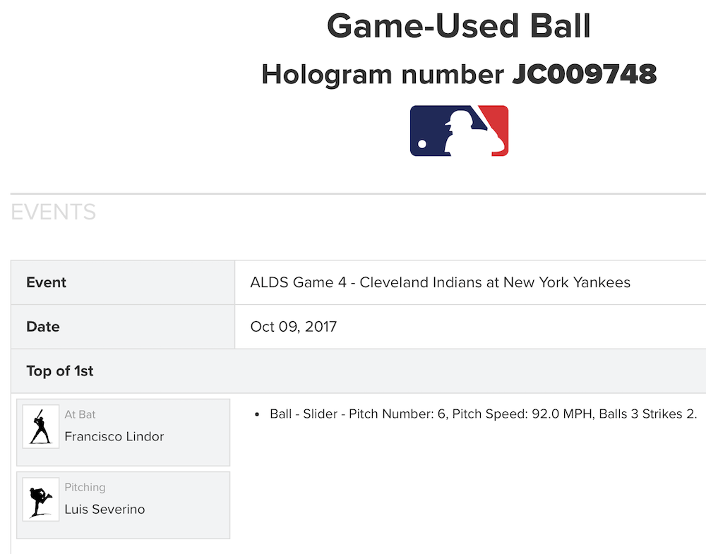Game-used ball (MLB Authenticated): Cleveland Indians at New York Yankees, American League Division Series Game 4 -- Oct. 9, 2017