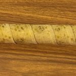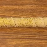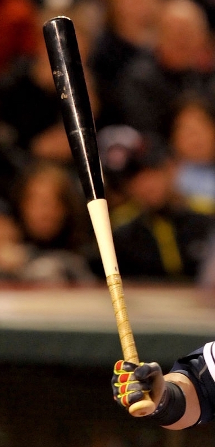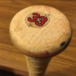 How was this possible? Some research and some luck -- but also knowing what things to look for with game-used bats. In this case, the bat model is somewhat common (used in his Yankees and then Indians years after Louisville Sluggers for most of his career before that) but the handle customizations were not the norm for most of his career. The grip was the first clue when trying to lock down a timeframe of when this bat was used and then a date written underneath the "33" sticker on the bat knob once in hand provided a starting point for still-image searches. Once I found those, then I went to video for additional ironclad matching.