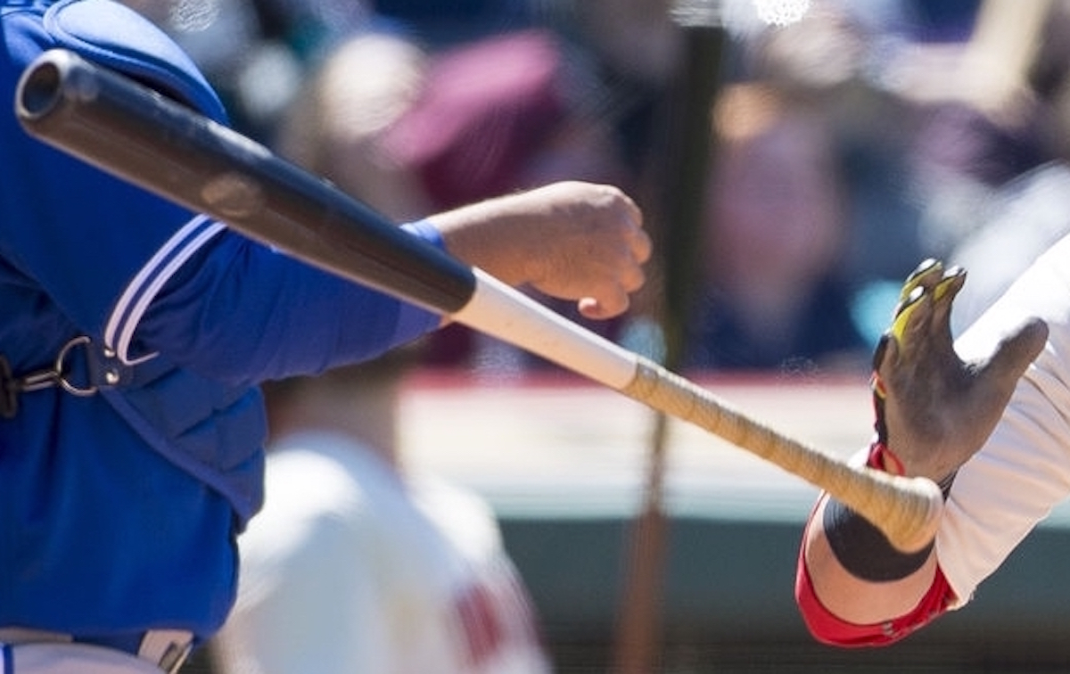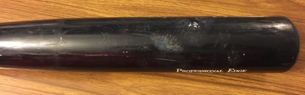 What's Buzz-worthy: If you click on the high-res video still up top and zoom in on the bat knob, you can see specs of black ink where the date "4 - 10 - 14" is written underneath the "33" sticker -- so that's a video match, too, beyond my stills that clearly show markings on the bat that match it in my hands today. That date is where I started with a search of the super-reliable and publicly available Getty Images preview images site. (It's also available free on your iPhone if you like apps and it's easily one of the most-important tools for collecting game-used stuff.) I found three images from two games where you can see this bat in use with its grip's logos and ending points matching up exactly with a black mark directly above where the Lizard Skins grip tape ends. You can match the logos on the tape, its angles and then markings on the bat that all align, though the black glossed surface in still photos sometimes reflects surface indentions more than any discolorations left on the bat from hits now. (This bat likely was used beyond these two days as it's definitely got some wear to it beyond what's seen on those two days.) I picked this one up for far less than what a 2020 Topps Series 1 box is going for right now and it easily could have carried a price double or triple that had it been MLB stickered or had a PSA/DNA letter. With the photo matches you can see here, it doesn't need any of that.