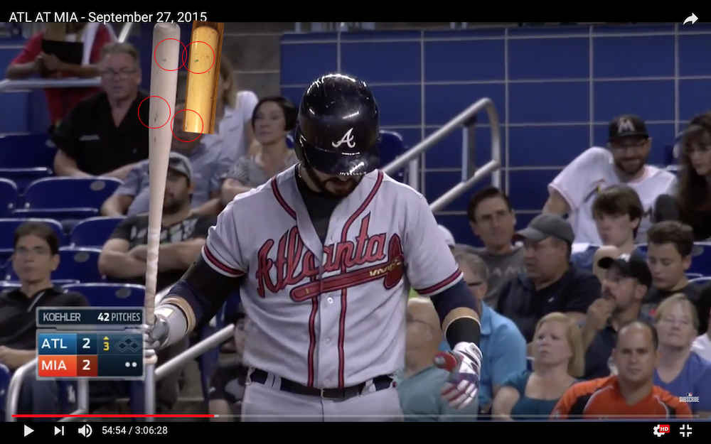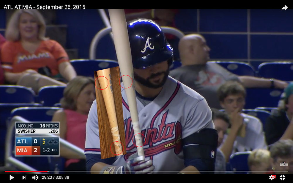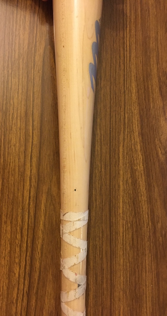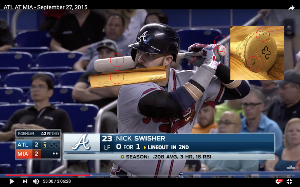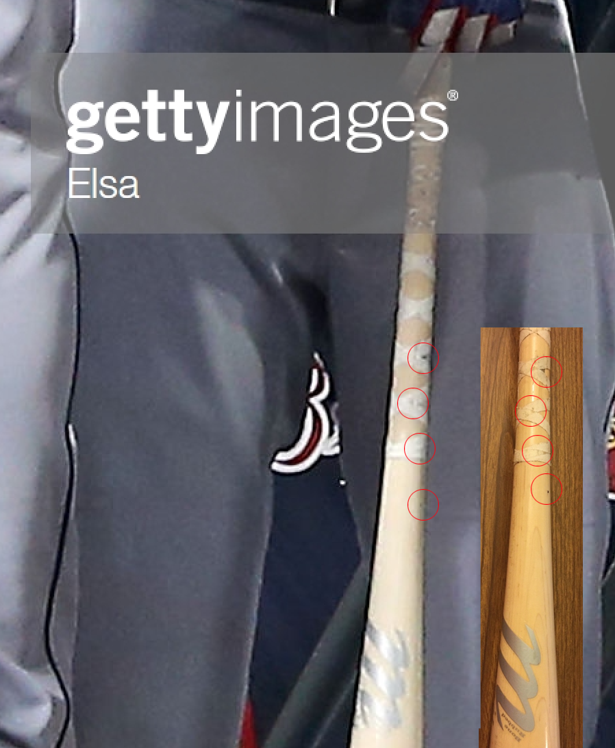 My angles aren't exact matches -- photographing bats isn't easy -- but it's close enough to get the gist of things. The possibility that a bat could have the same exact marks in the same positions across all of the wear and tear here is simply impossible. Check out the gallery and examine it all. It's definitely a match.