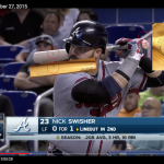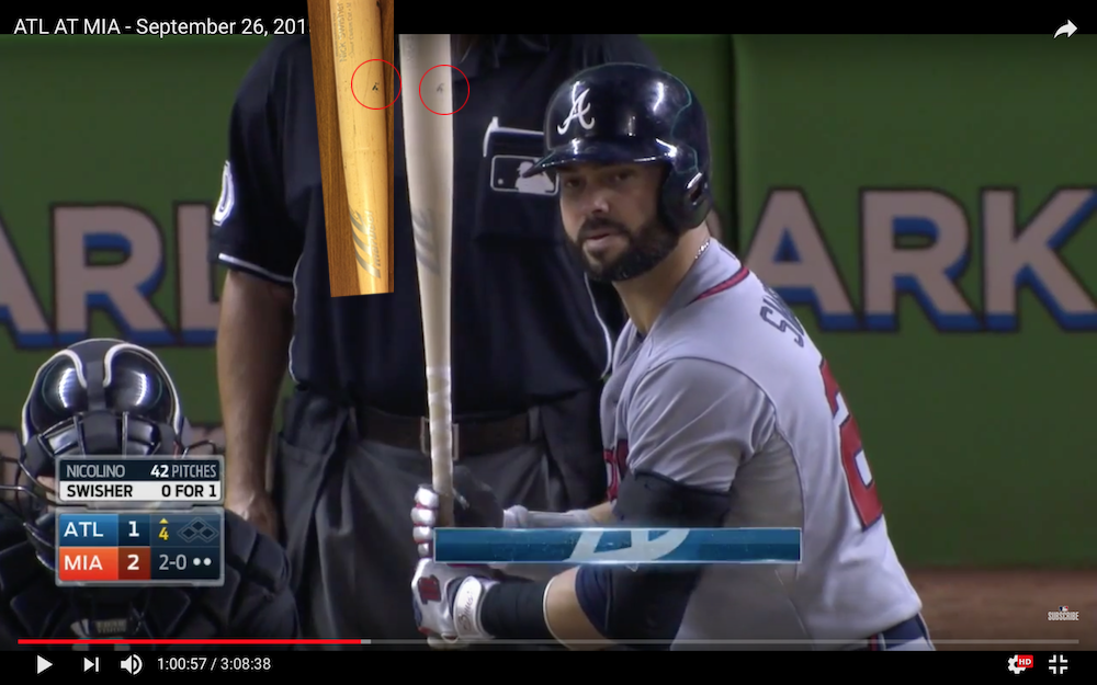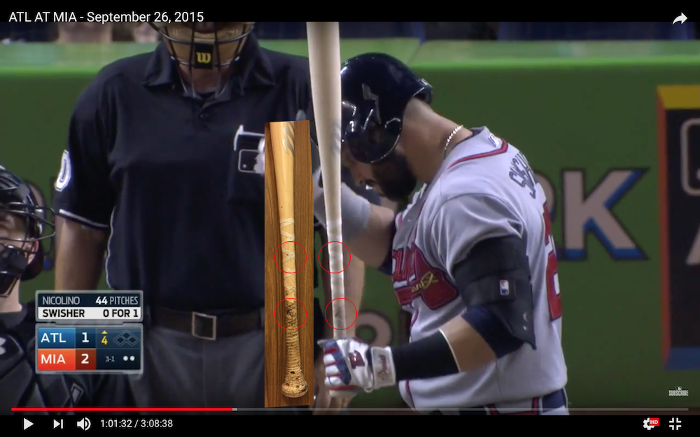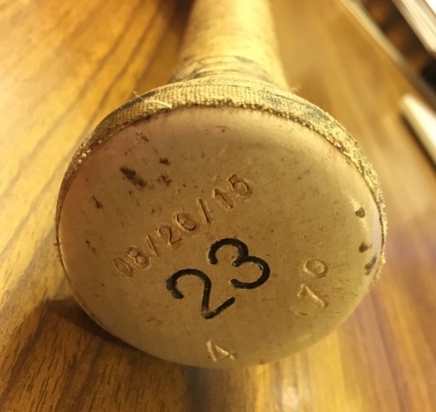 What's Buzz-worthy: The knob is the starting point here -- "08/26/15" is its factory stamping, its birthday of sorts -- and the bat is also simply stamped with his uniform number from this time, 23, rather than having some elaborate knob writing or sticker that he often used throughout his career. That marking gives a start time and a way to eliminate this bat from others. My first stop? The Getty Images photo app -- a publicly available phone/web resource for anyone to peruse when researching -- and I was able to cancel out several games (or at least narrow my dates) based on bat models and their colors. Early in his career, Swisher used one color of bat batting lefty and another color righty -- that still applies to some degree.