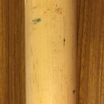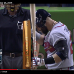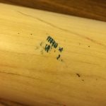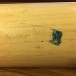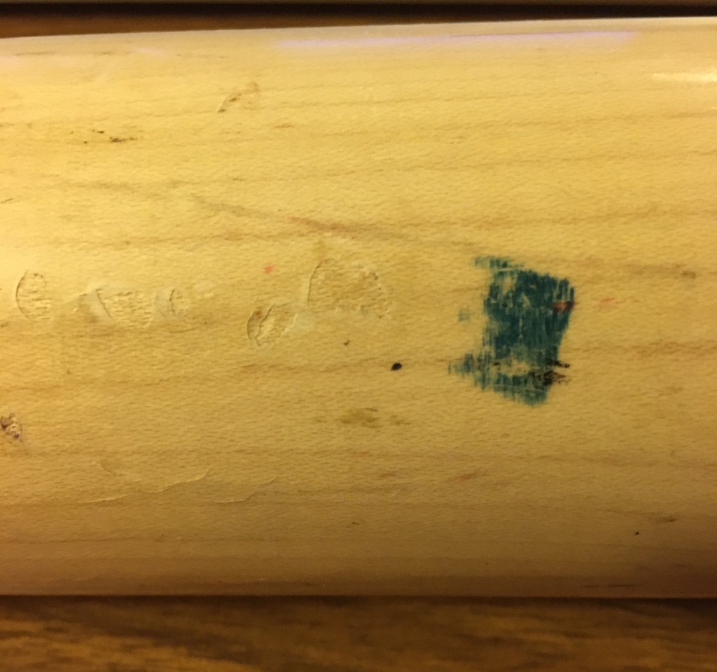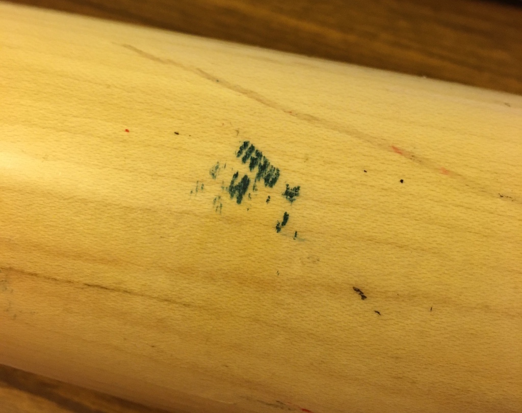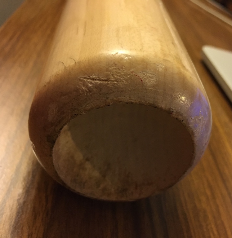 While this bat was born on Aug. 26, it was in the bat rack/bag/etc. off and on until I was able to match it to in-game action to a pair of road games in late September. I found his at-bats in those games (links above) and matched this bat a few times in a few ways but it was clearly used at other times (perhaps batting practice?) as well. Why? Because its many small markings weren't picked up by the broadcast cameras during night games or they simply were not there yet. (Lighting and resolution while streaming can create some crazy screenshots of a moving object or person but I did my best.) I have paired (somewhat amateurishly) some stills from the games with some detail shots I took of the bat now to ID spots. In their positions all together, they definitely show this to be that bat. There's always the caveat that the video stills are from throughout its lifetime of use compared to how it looks now. (For example, I have no idea when its handle was cracked and it was retired.)