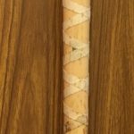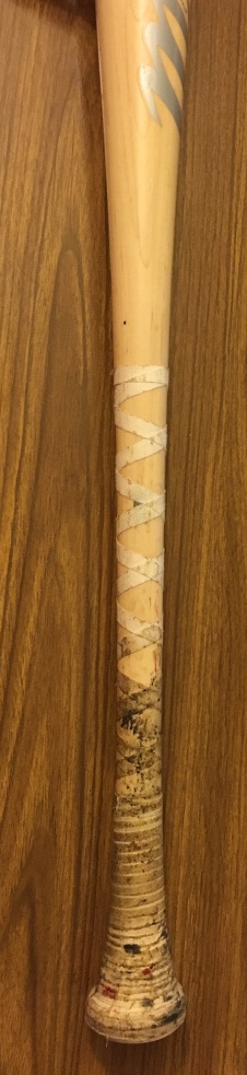 Photos from the stretch of games from Aug. 26 to the season finale (and his career finale) on Oct. 2, show a few different types of bats used. For most, he did not use this model and just a single photo taken by Getty's mononymous shooter Elsa on Sept. 23 provided me with an ironclad match in the dugout. Game action? Not so much. My bat might have been used in that game -- he did use the same model against the Mets -- but in MLB video for two at-bats it was clearly a different dirtier bat than mine. There was a brand-new clean bat used for an at-bat in between those, though. Was it mine? Maybe, but I can't prove it based on any markings like I can with the still photo of its handle in the dugout. As you can see above, the tape job has one of his criss-crossed patterns going over a dark mark on the bat's handle (third X from the top of the bat on the right side) and you can see a hint of a dark spot on the bat also showing in the image at a closer view. Barely. The tape and that spot make it a match, though -- a dugout game-used match. You also can also see some of the stains on the tape then and now. (See all of this in the gallery below.)