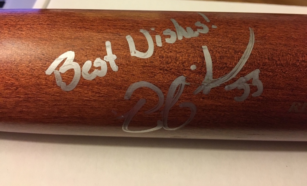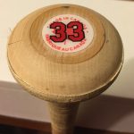 The bat has a red "33" sticker on the knob atop its Made in Canada sticker and that reinforces (along with the ordering timeframe) that this was a bat used for his first year in Cleveland. Meanwhile, the only photos I could find on Getty Images' publicly available database of preview images were in early 2012 when he was with the New York Yankees and used a different color of Rideau Crusher (see gallery). Overall, there are few images of him using Sam Bats -- definitely a lot more using other companies' models -- and that also reinforces the rarity here. To further authenticate it, it's got his trademark handle taping and some grime on that, while the handle and barrel are very clean compared to my other gamers where they can be absolutely demolished and caked in grime. This bat has a thicker finish to it and is solid and uncracked -- the only marks that are visible are some ink transfers in one spot on the meaty spot of the barrel and then some light light ball seam indentations across the barrel -- all indicating this was a bat not used for long. (That also explains why I can't find photos.) It being signed also indicates it could have been given away or perhaps provided for an event, which might be why it's a cleaner bat. There's no doubt in my mind this is a premium gamer -- Sam Bats are a bit pricey compared to other brands for both players and often for game-used collectors -- it just wasn't used for long.